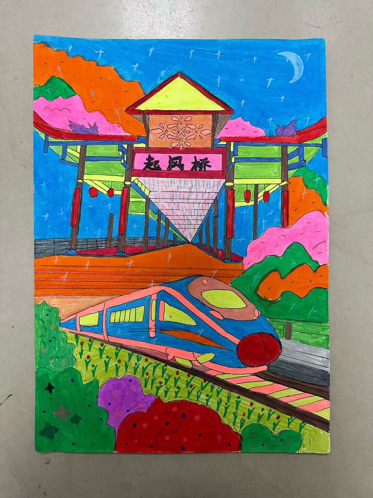它绘的是巴中起凤桥与动车同框的图景:起凤桥是恩阳古镇的传统廊桥地标,而动车则呼应着巴中近年的交通发展(如汉巴南高铁)。画中传统飞檐与现代列车交织,既藏着巴中山水古镇的古韵,也显露出这座川北城市“老韵新声”的发展活力,是巴中古今交融的生动缩影。