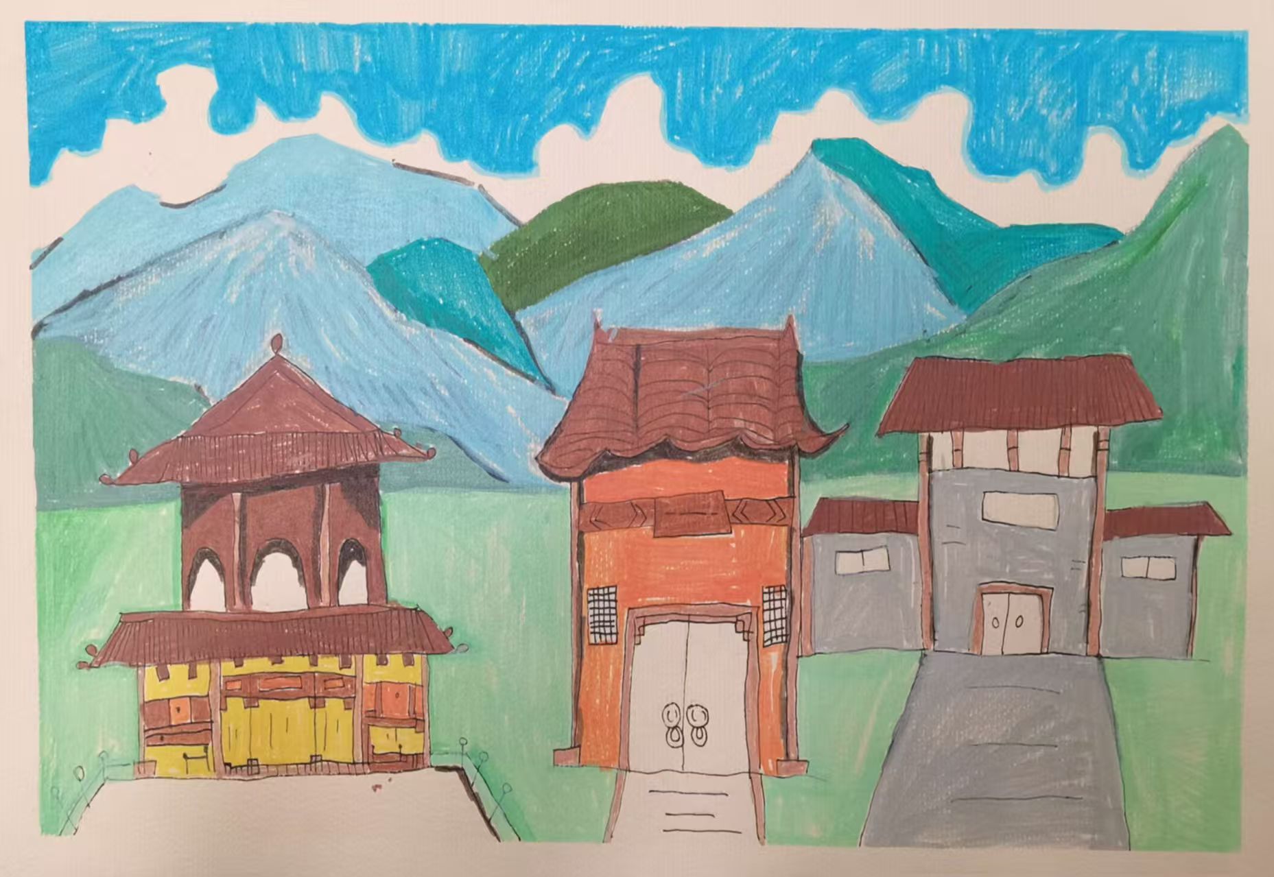 这幅画是一幅彩色手绘风景图,展现了一处山间村落的景象。建筑:画面中有多座房屋,屋顶多为棕色,房屋主体颜色丰富,有黄色、橙色、灰色等,部分房屋带有拱形结构或门窗细节,风格质朴。自然环境:背景是连绵的山峦,以蓝、绿等色绘制,色彩明快;地面(或草地)为浅绿色,整体营造出清新自然的山间村落氛围,色彩搭配活泼,充满童趣与生机。