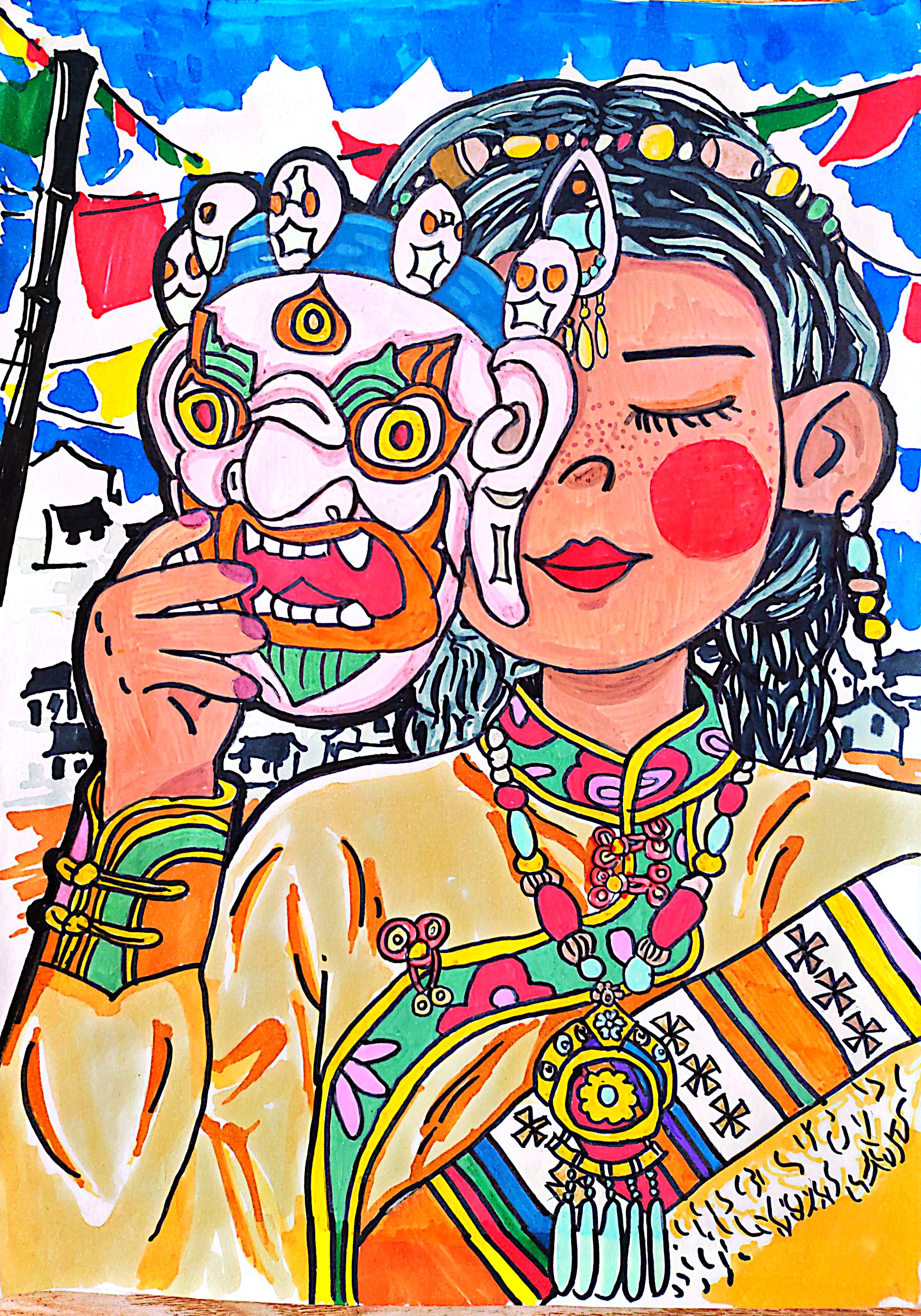 锚定西北少数民族的傩戏民俗——这一承载祈福、驱邪意涵的传统仪式,画中面具是傩戏里的典型"护法"造型,少女服饰的刺绣纹样取自当地羊毛绣工艺,背景村寨是西北高原聚居的石砌院落,隐约的经幡元素呼应地域信仰风貌。以鲜活色彩绘就少女与面具的互动,既还原了民俗活动的生动现场,也传递出西北少数民族文化里的热烈与传承温度。
