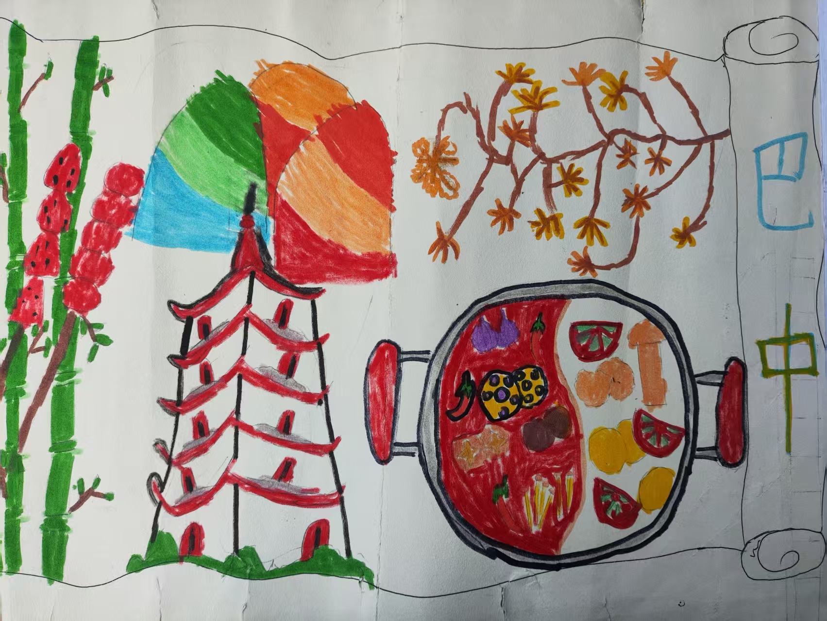 地域符号整合: 以巴中标志性建筑(红塔楼阁)、特色美食(鸳鸯火锅)为核心元素,搭配 "巴中" 文字标识,直接锚定地域属性;辅以本地自然意象(花卉、竹林),丰富地域风貌的视觉表达。 载体与氛围营造: 采用卷轴形制作为画面框架,契合传统文化的表达形式,同时通过鲜明色彩(红、绿、橙)强化视觉张力,传递巴中 "人文建筑 + 市井美食" 交融的烟火氛围。 元素关联叙事: 建筑、美食、自然元素在卷轴中并置,既体现巴中 "山水之城、美食之地" 的多元特色,也通过手绘笔触的轻松感,让地域文化符号与生活场景自然联结。