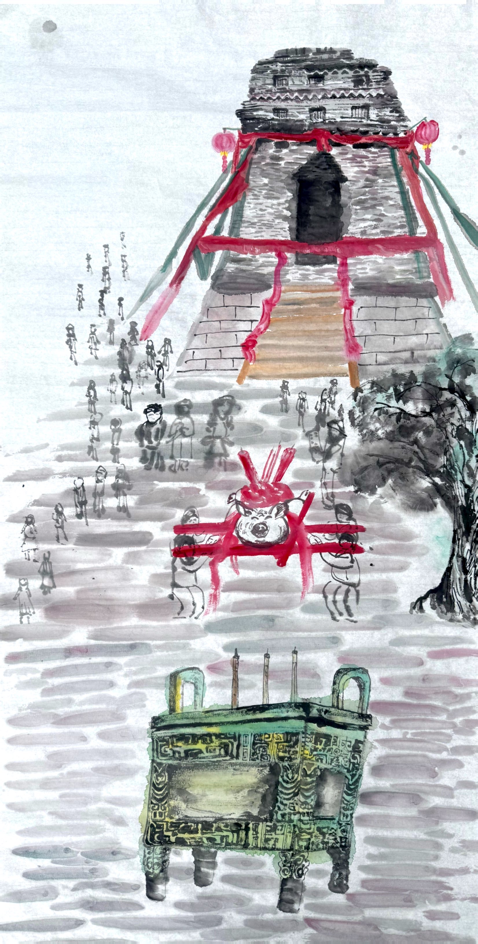 这是一幅国画作品,作品以古塔祭祀场景为原型:水墨绘出层叠石坛,红绸装饰添了仪式感,人群聚集,前景青铜鼎器显庄重。浅淡的色调衬出古塔的肃穆,红绸的亮色又让传统仪式多了当代的鲜活感,似在演绎古今共通的文化敬畏。
