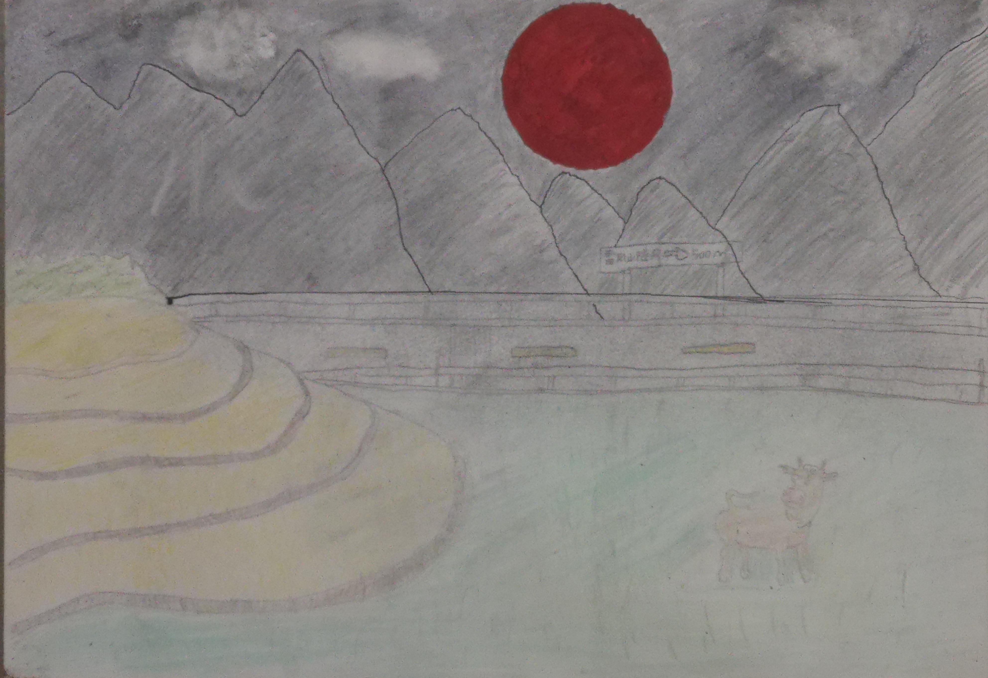 这幅画是我与四川南充老家的自然风光为灵感,绘出一群群清黛色高山连绵起伏,峰顶缠著轻纱般云雾。山间层层田梯铺展,春种嫩绿与秋松金浪交织,村后草原上黄牛悠然啃青。蜿蜓的高山马路穿村而过,带着农具的摩托,追逐嬉戏的孩童,让画面满是烟火气。我用细腻笔触定和这份纯粹乡土韵味,愿将老家的静谁谧与鲜活,分享给每一位观者