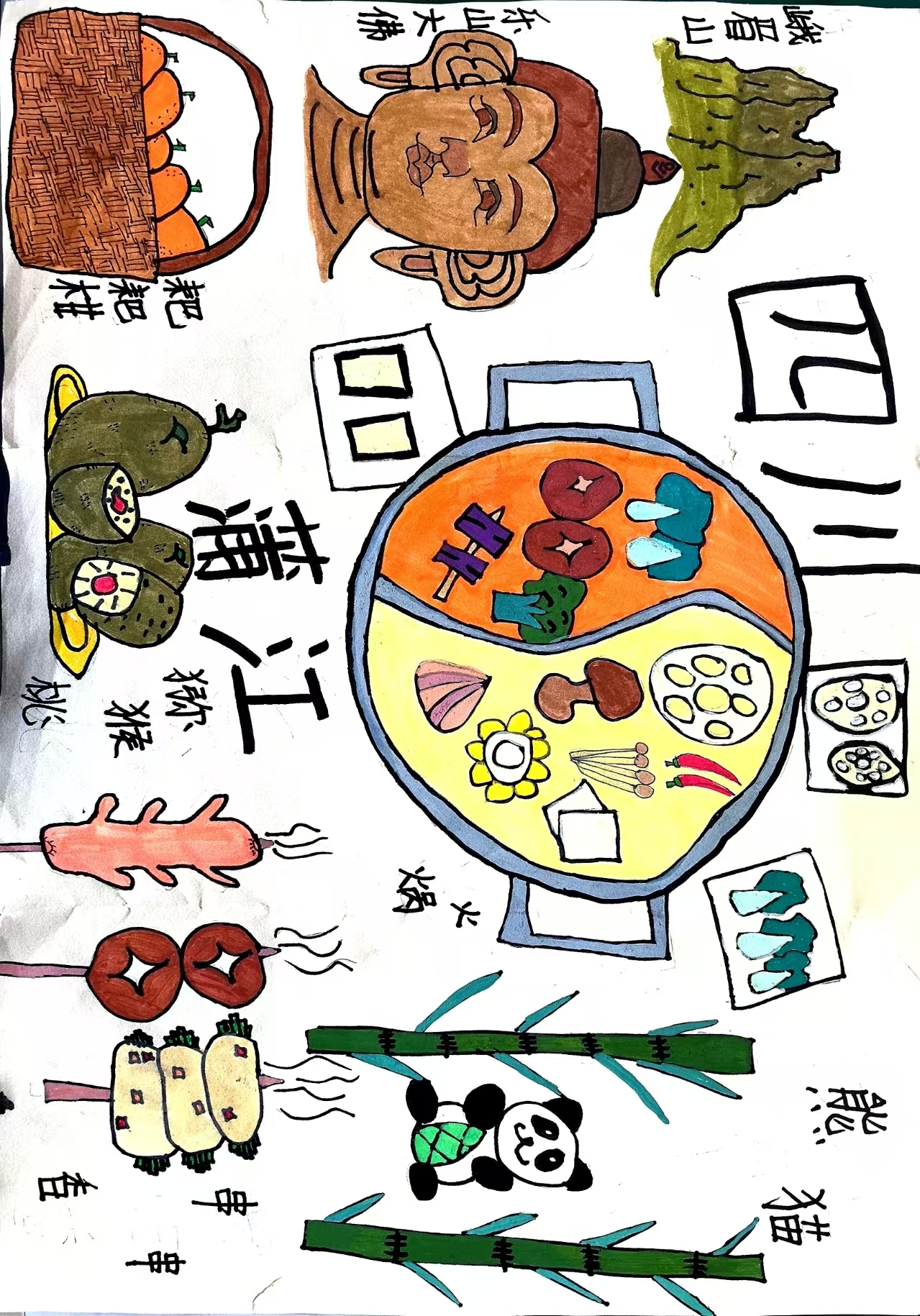 这幅《川味山水图》,是想把家乡的烟火气和山水魂揉进一张纸里。乐山大佛的慈悲,峨眉山的灵秀,是刻在记忆里的地标。火红的火锅红汤,串串的竹签是街头巷尾最浓的乡愁。猕猴桃的甜,柑橘的果酸,像小时候爬上树摘果子的酸甜回忆。 这里的山水养人,这里的景色迷人,这里的味道醉人……