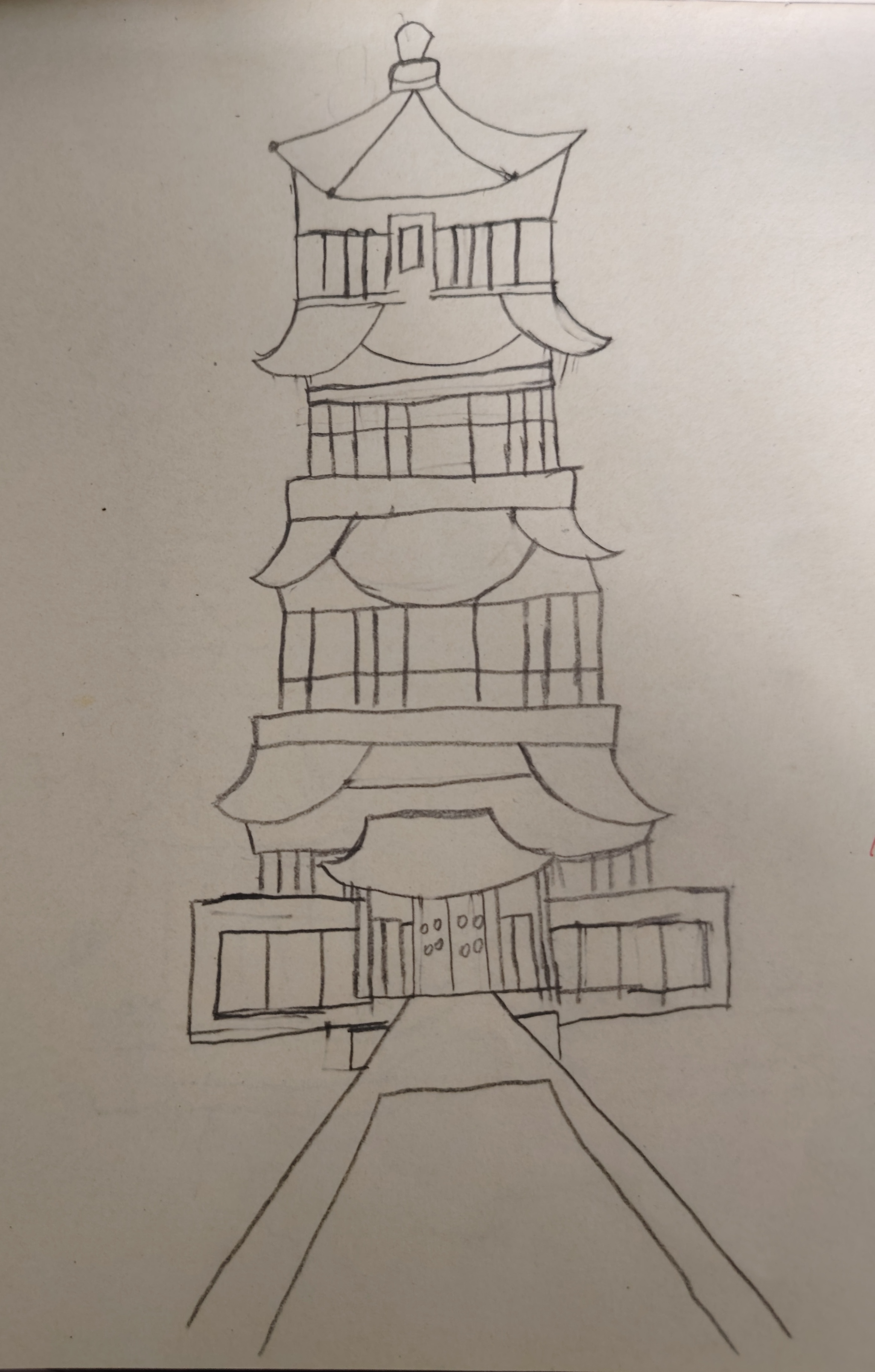 我以简洁的线条勾勒出传统楼阁的形制——层层飞檐向上收束,搭配底部的门楼与引道,既还原了中式建筑"层叠递进"的空间韵律,也通过概括的笔触保留了速写的松弛感。画面以平视视角聚焦建筑主体,弱化细节而突出结构,传递出传统建筑在简洁线条里的古朴与秩序感。