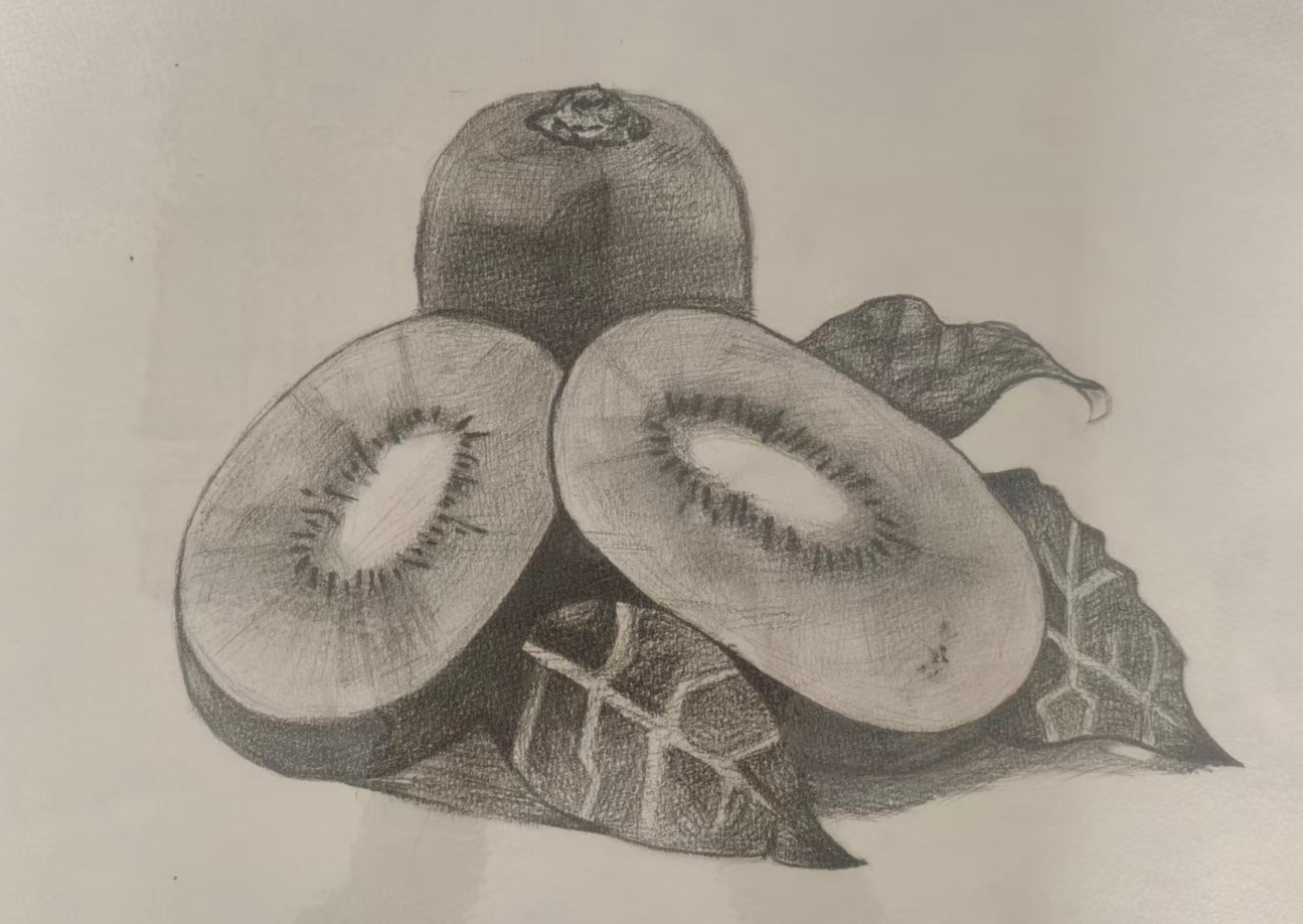 这幅素描以猕猴桃为核心创作对象,完整果实与切开的果肉形成鲜明视觉对比,叶片作为衬景丰富画面层次。创作者以细腻的排线技法,精准塑造果皮的粗糙肌理、果肉的绵密质感,以及果籽的疏密排布,叶片脉络的明暗刻画亦生动自然。画面构图紧凑且主次分明,光影过渡柔和且富有体积感,既还原了猕猴桃的写实形态,又以简洁的视觉语言凸显蔬果本身的质感与生命力,尽显扎实的造型把控能力