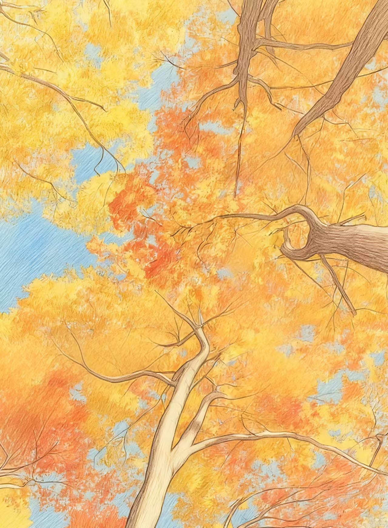 以仰视的视角,将秋日树木作为自然界的诗人,通过其绚烂的色彩和舒展的姿态,记录下一场生命与季节、大地与天空之间的静默私语。它邀请观者停下脚步,仰望这片绚烂,静静聆听秋天诉说的、关于时光与生命的丰盈诗篇。