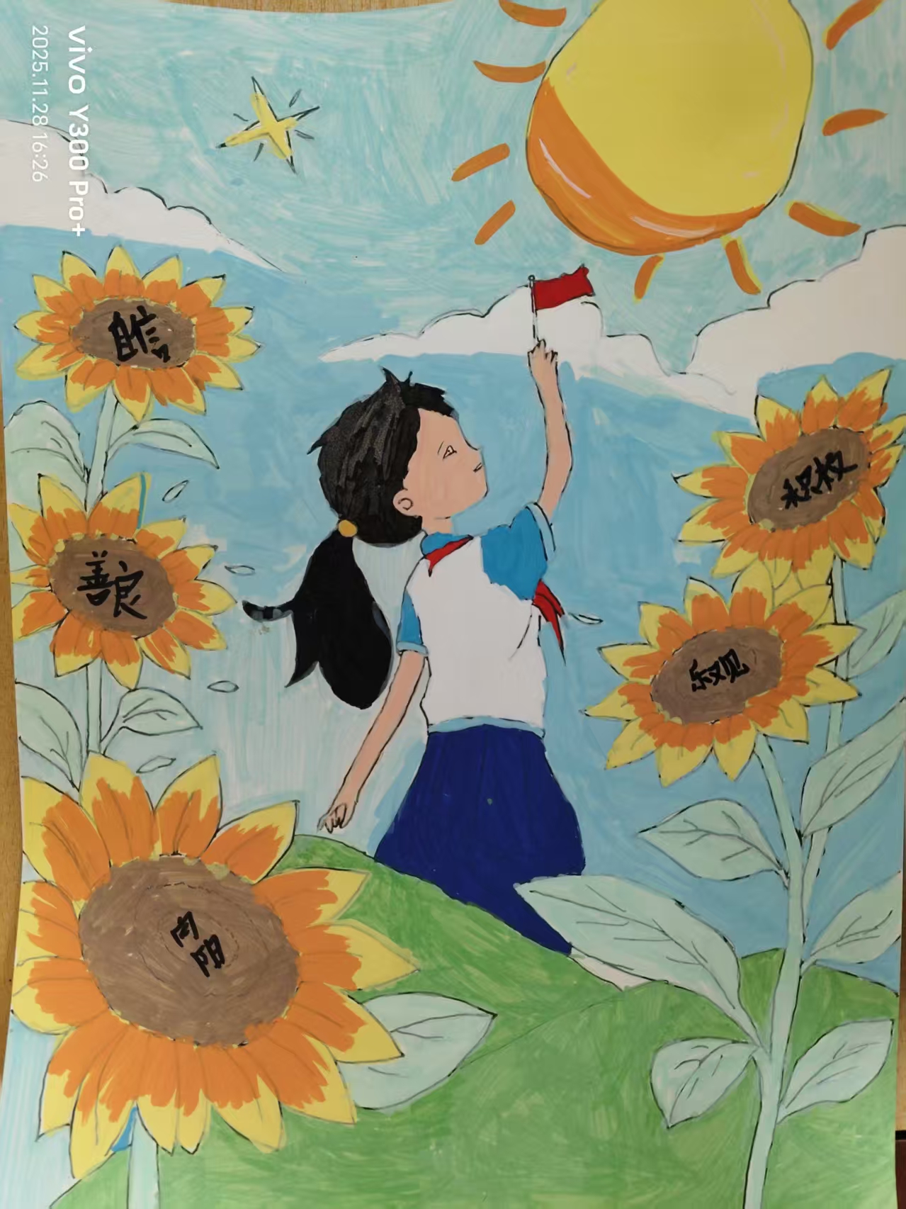 太阳照耀着大地,我唱着歌儿,高兴的走在乡间的小路上,天是那么蓝,草是那么绿,田间长满了向日葵,就好像来到的梵高的画景,此时我感到向日葵的生命力是那么旺盛,向日葵就是生命的象征。我就要像向日葵一样热爱生活,热爱生命。
