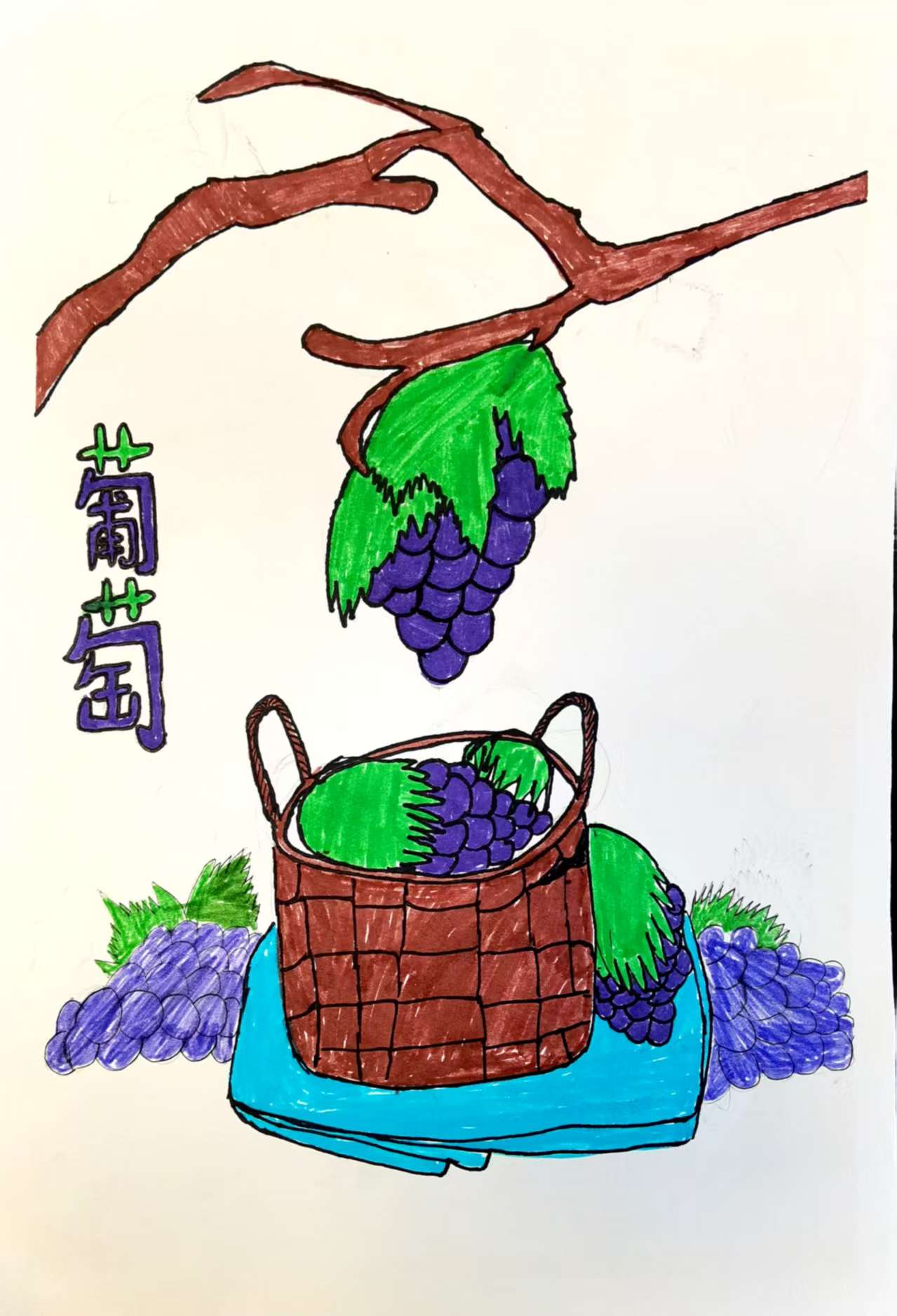 这幅画是一幅以葡萄为主题的儿童画。画面上方,棕色的葡萄藤枝杈间,挂着一串带绿叶的紫葡萄。左侧有竖写的“葡萄”二字。下方,蓝色布上的棕色竹篮里装满带叶紫葡萄,布的左右两侧还各有一串带绿叶的紫葡萄。整体色彩鲜明,展现了葡萄收获的场景,画风童趣,用简单线条和色块勾勒出葡萄的形态与丰收氛围。