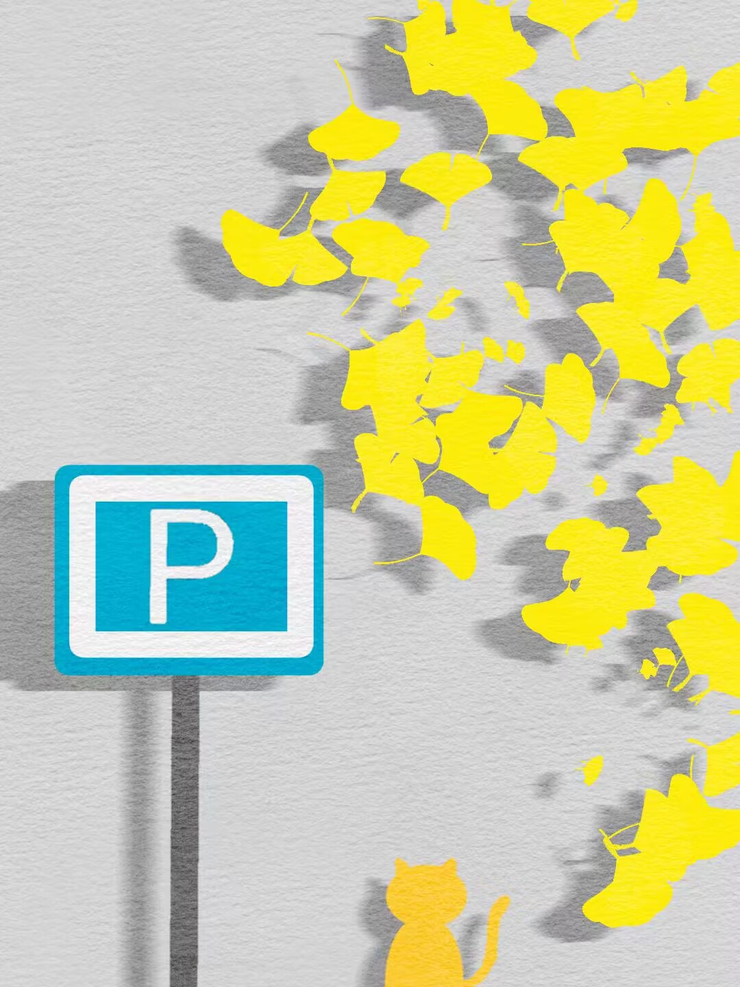 通过极简的构图和克制的色彩,将街角、猫咪、银杏叶这些寻常事物并置,在一个被抽象化的城市背景中,刻意营造出一个抽离于喧嚣的宁静空间。它邀请观者暂时停下脚步,像画中的猫一样,去发现和感受日常生活中那些细微、短暂却充满诗意的美好时刻。