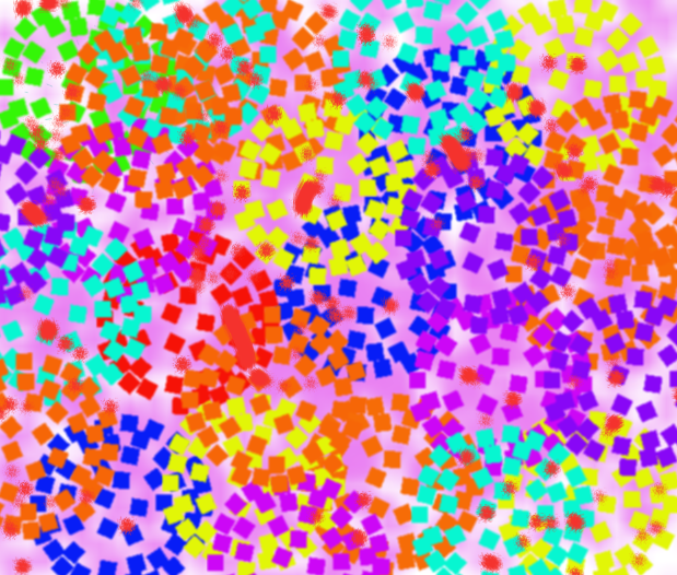 名字:《奶奶的花窗帘》 简介:这幅作品以"奶奶的花窗帘"为主题,缤纷色块如记忆里的碎花,在粉紫底色上铺展。红、黄、蓝、绿相互交织,似奶奶一针一线缝入的温暖,每块色彩都是旧时光的片段,唤起对奶奶家温馨日常的眷恋 。