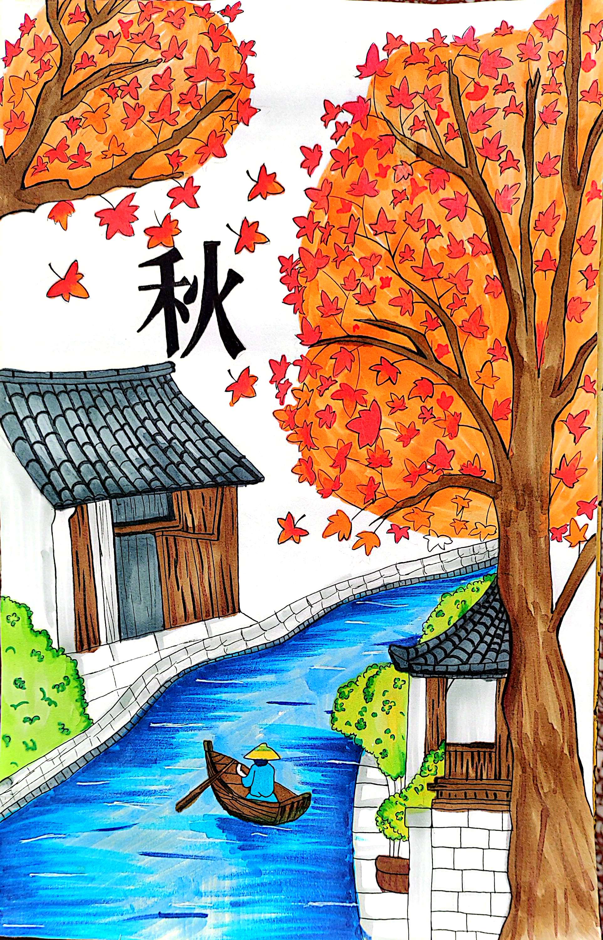 名字:《水乡秋韵》 简介:这幅画勾勒出诗意的水乡之秋,河畔古朴屋舍错落,澄澈河水蜿蜒,小舟悠然,戴笠者似在聆听秋声。两岸枫树如烈焰,红叶片片飘落,与 "秋" 字呼应,将江南水乡的温婉与秋日的绚烂相融,传递出宁静悠远又饱含生机的季节氛围,尽显自然与人文交织的美。