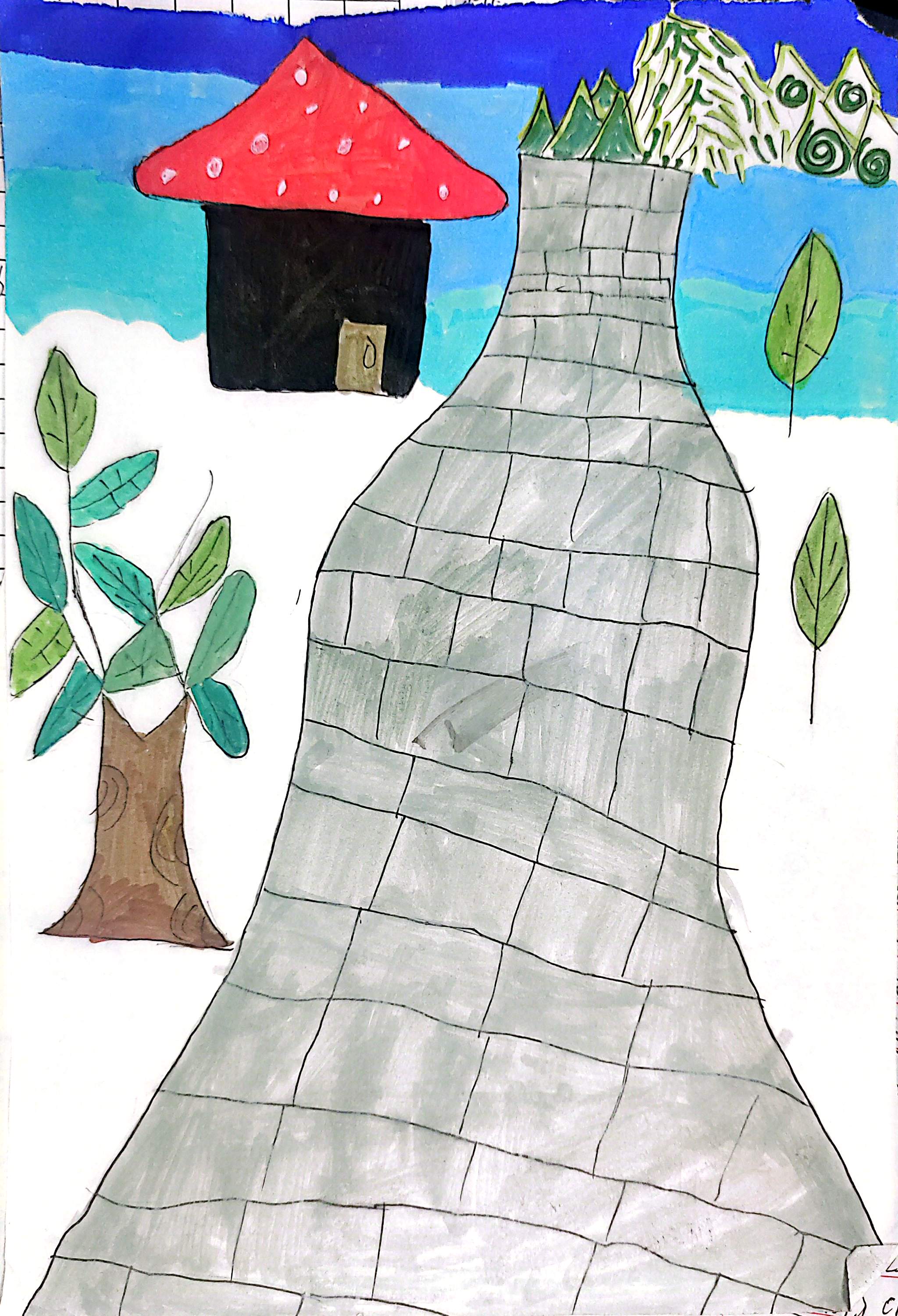 名字:《童话小径》 简介:这幅儿童画满是童趣,灰石小径蜿蜒,蘑菇顶小屋像童话里的家,绿树、飘叶点缀,背景蓝天、远山添梦幻。孩子用色彩与线条,构建出纯真的童话世界,每处细节都藏着对美好故事的想象,是童年创意的生动绽放 。