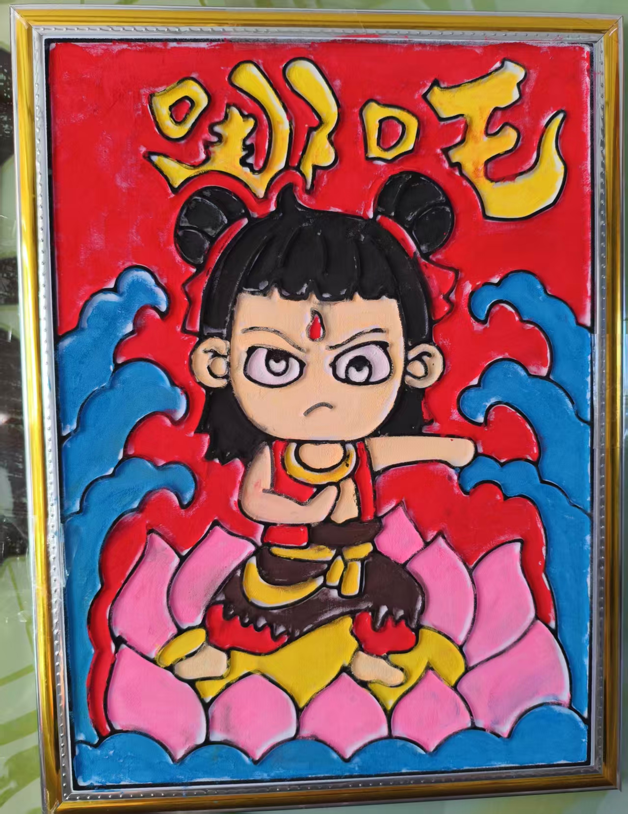 2025年最火的人物就是哪吒,城里的孩子们可以进电影院看哪吒电影, 我们这儿没有电影院,只能是看一些图片,感受哪吒的威武刚强,昨天我的姐姐从县里回来了,带了一幅哪吒的沙粉添色画,让我也感受了一把制作哪吒作品的风采。 这个沙粉添色画真实也很简单,人物已经做好了,也是3D立体效果的,我们只是根据人物的特色把不同的色彩填上去就可以了。 半天的功夫我的沙粉画就完成了,姐姐还用一个老旧的相框给我装了起来,这不我的哪吒作品就完成了吗、