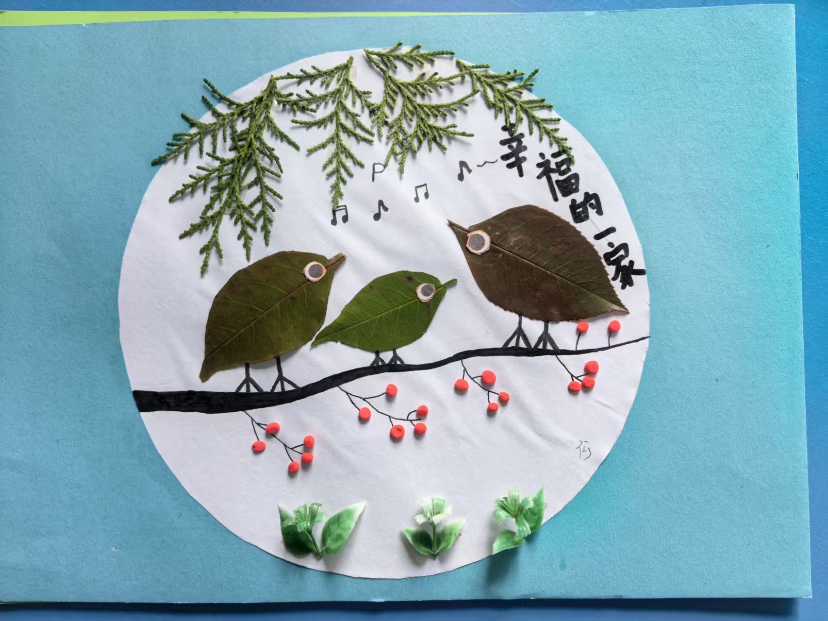 树叶是生活中常见的手工制作的材料。利用手工拼贴的方式,用极少的树叶拼贴出小鸟的一家。利用树叶又环保又简捷,突出树叶本身的质感和形态变化,把平时观察到的小鸟融入画中。强调自然环境与鸟类生存的紧密联系,传递生态保护意识。保护鸟类就是保护我们的生活环境。