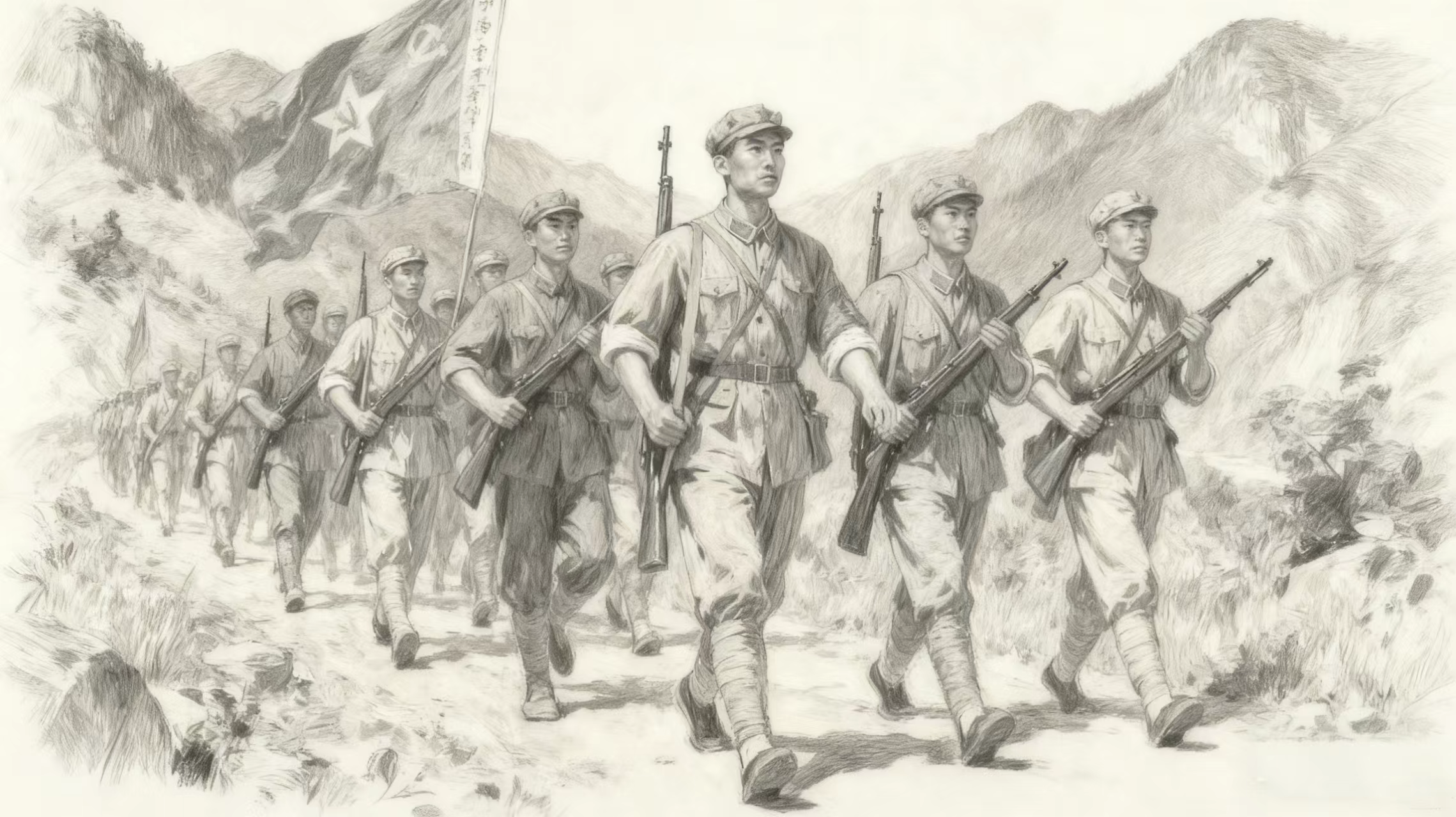 特意把旗帜画得沉实又舒展,让布料的褶皱裹着风的形状;前排战士的轮廓用了更重的笔触,后队的身影慢慢融进山雾里,像把"队伍从历史里走来"的感觉铺在纸面上。画到他们的眼神时停了很久:没有刻意渲染悲壮,只留着"一步接一步走下去"的笃定——这才是最该被接住的力量。