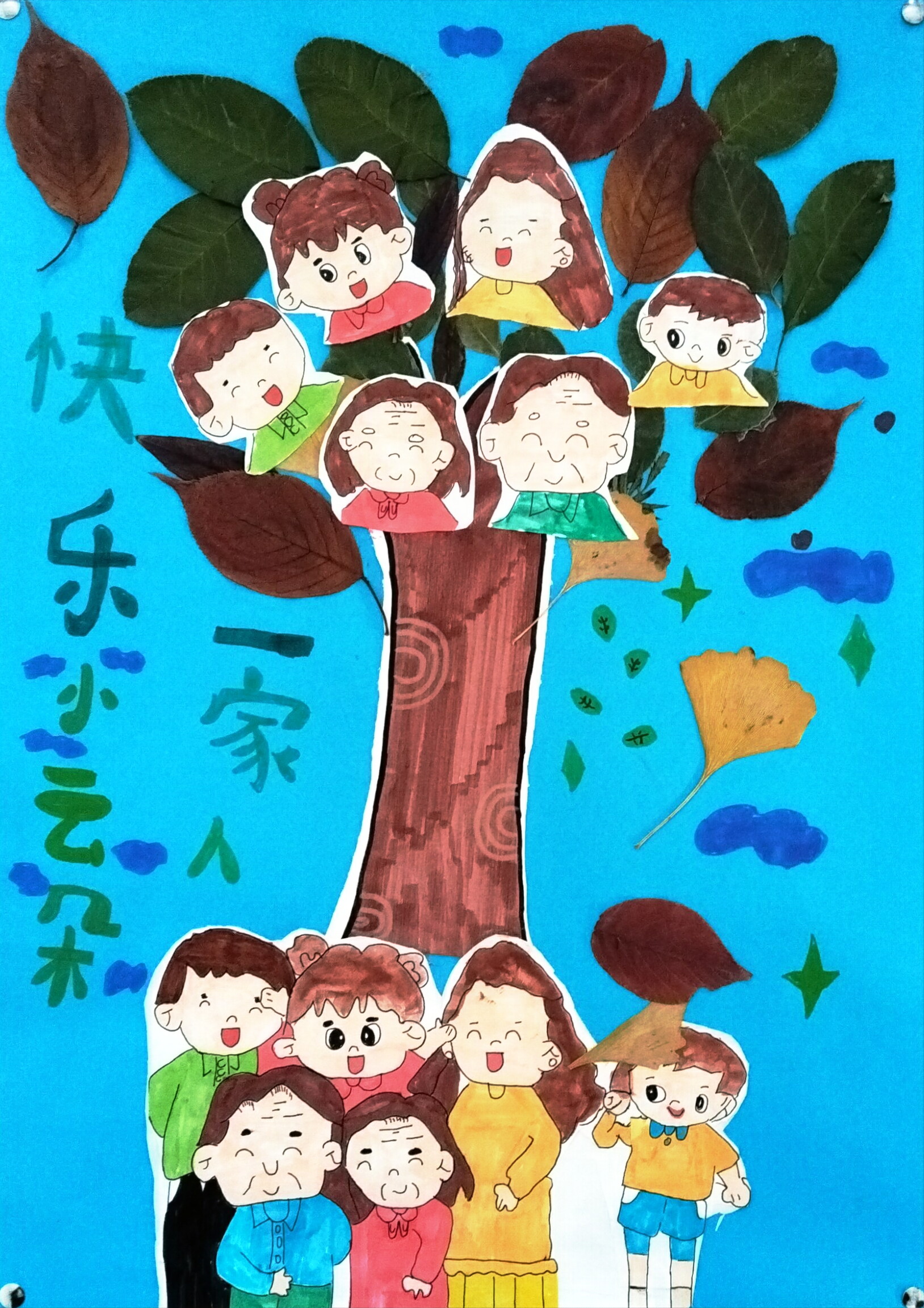 以 “家庭树” 为核心创意,用真实落叶拼贴成树的形态,手绘家人形象分贴于枝叶与树下,呼应 “家人是彼此的依靠”。蓝天底色搭配云朵、星星装饰,既借树叶象征家庭的温暖庇护,又通过笑脸形象传递出一家团聚的欢乐氛围,温馨又生动。