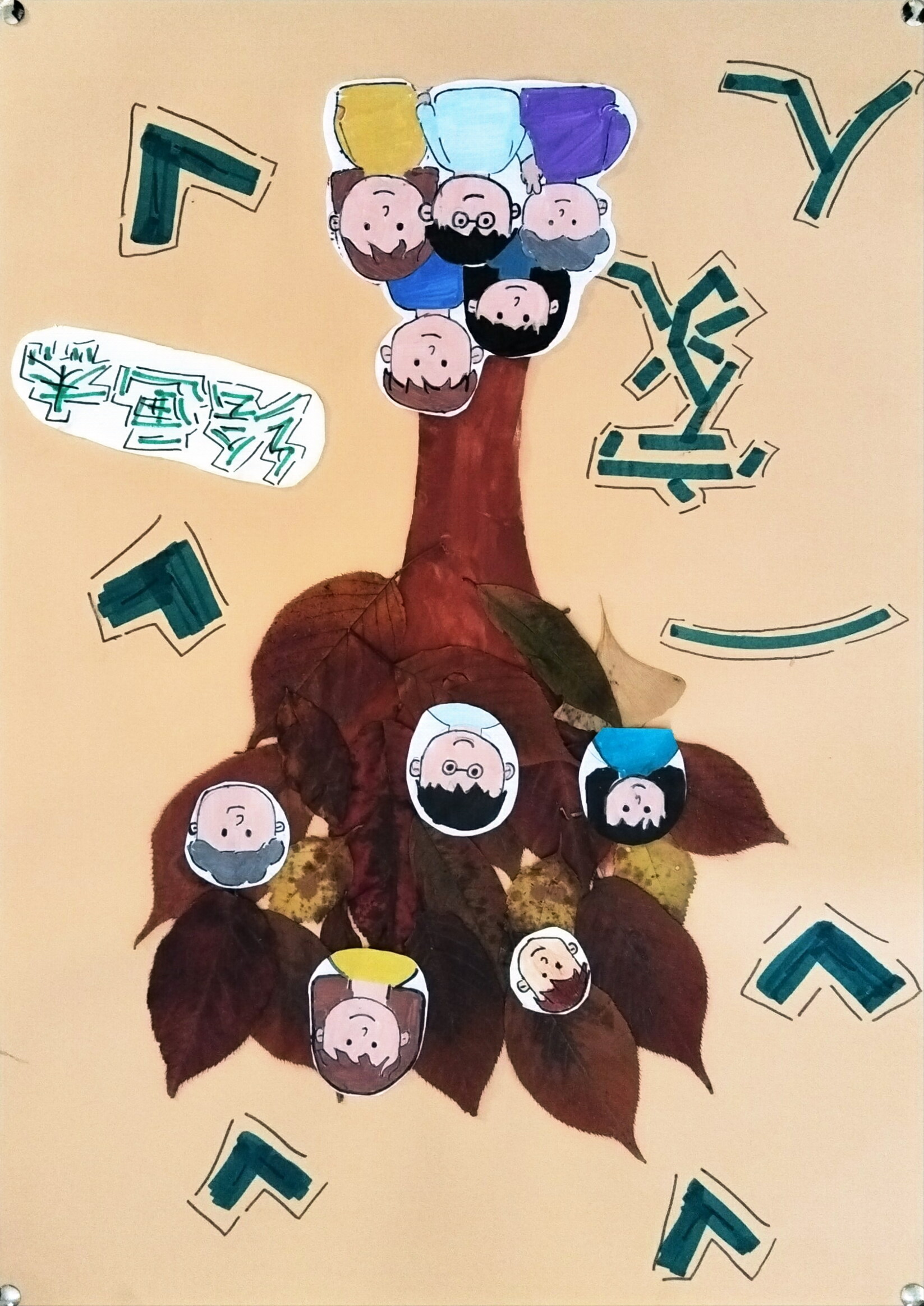 以落叶拼贴成树的形态,将家人形象分贴于 “树冠” 与 “树根” 处,既借树的 “枝叶相连、根脉相依” 象征家庭的紧密联结,又以暖黄底色 + 装饰符号烘托团圆氛围,“团圆” 字样点明主题,让家人相聚的温暖在创意拼贴里具象化。
