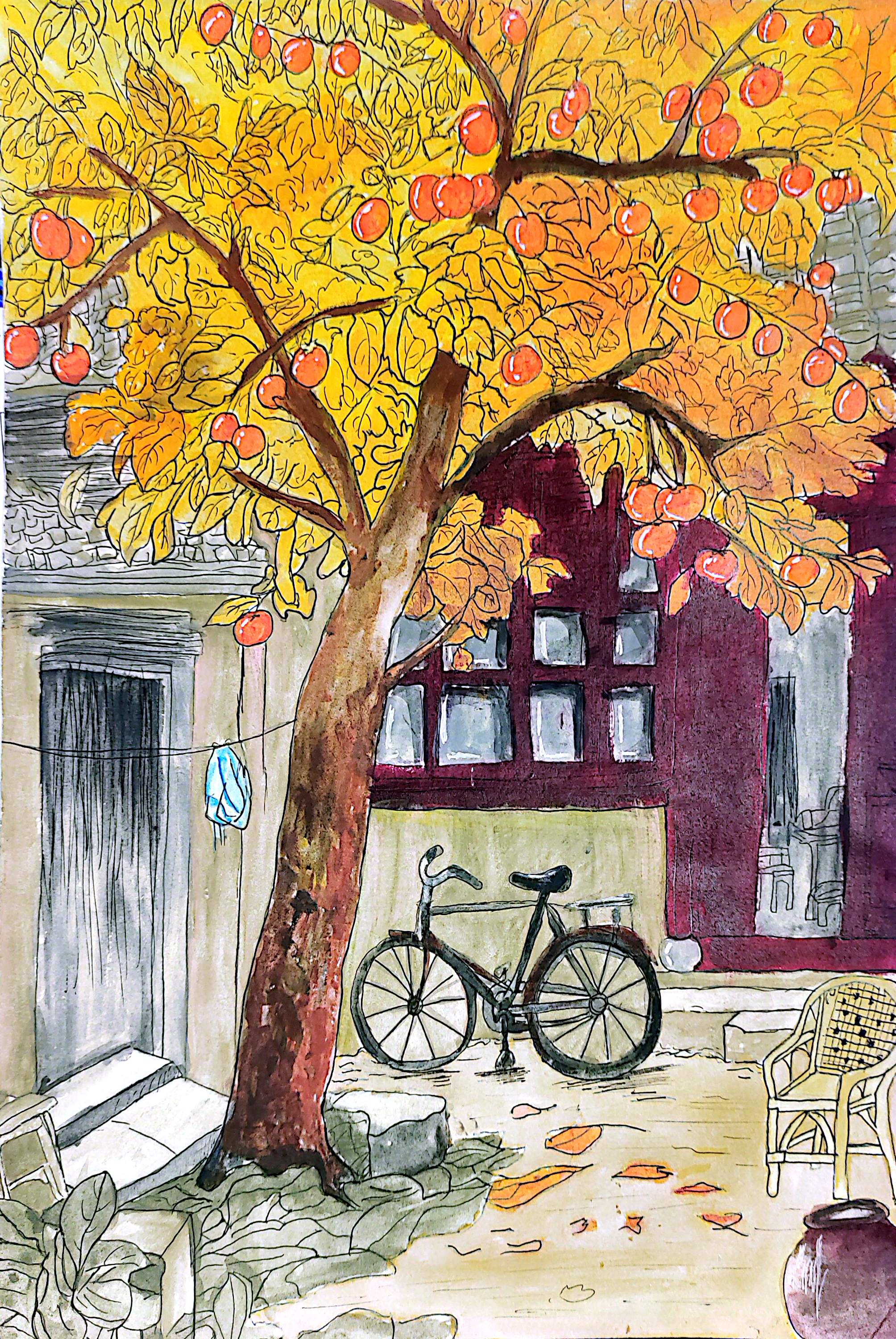 名字:《故园柿语》 这幅画勾勒出充满温情的故园一隅。金黄的柿子树如华盖,沉甸甸的果实诉说丰收。老旧自行车、古朴屋舍,满是岁月痕迹。飘落的黄叶、晾晒的衣物,将日常烟火与怀旧氛围相融,似在轻声讲述往昔故事,唤起人们对故乡、对旧时光的眷恋与回忆 。