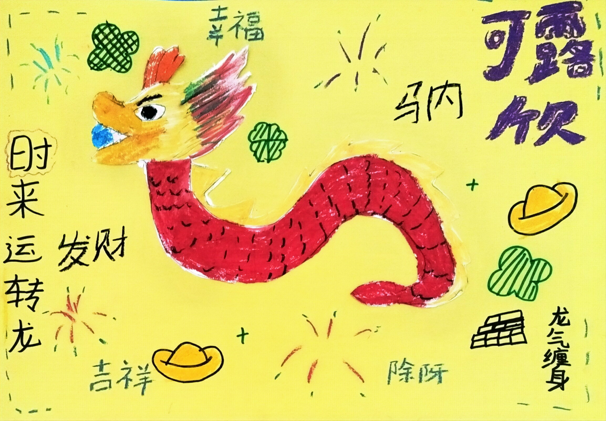 以手绘红鳞龙为主角,搭配 “时来运转龙”“吉祥发财” 等吉语,辅以元宝、四叶草装饰,既借红龙的传统吉祥意象传递好运,又用 “可露饮”“纳” 等趣味标识增添个性。明黄底色 + 烟花元素烘托喜庆氛围,让生肖龙的祝福寓意在活泼创意里变得鲜活又讨喜。