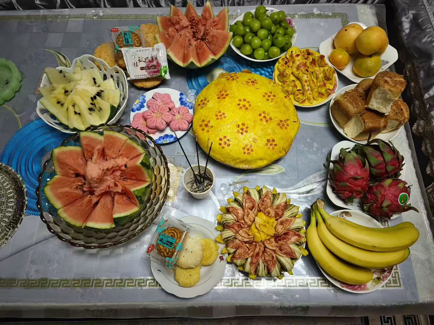 中秋节是我们传统的节日,中秋也是丰收的季节,年过中秋一切都马上成熟了,为了庆祝这个快乐的节日,我们会准备很多好吃的以贺中秋。 "中变节日蒸馒头,蒸下的馒头车轱辘大,姑娘吃上把炕压塌,小媳妇吃上上不去炕"这个流传至今的民谣说明在中秋节时我们家家户户都蒸车轱辘大的馒头,这个馒头就是我们所说的月饼。 大大的月饼直径大约有70厘米,在蒸两个多小时才能熟透,并且是用各种颜色的可食性颜料或是植物的花研成粉掺到清油里去摊成张张子一层一层叠起来做成的,蒸好的月饼不能提前切开吃的,必须等到八月十五日晚上献在月亮下等一柱香烧完了磕过头才能吃的。