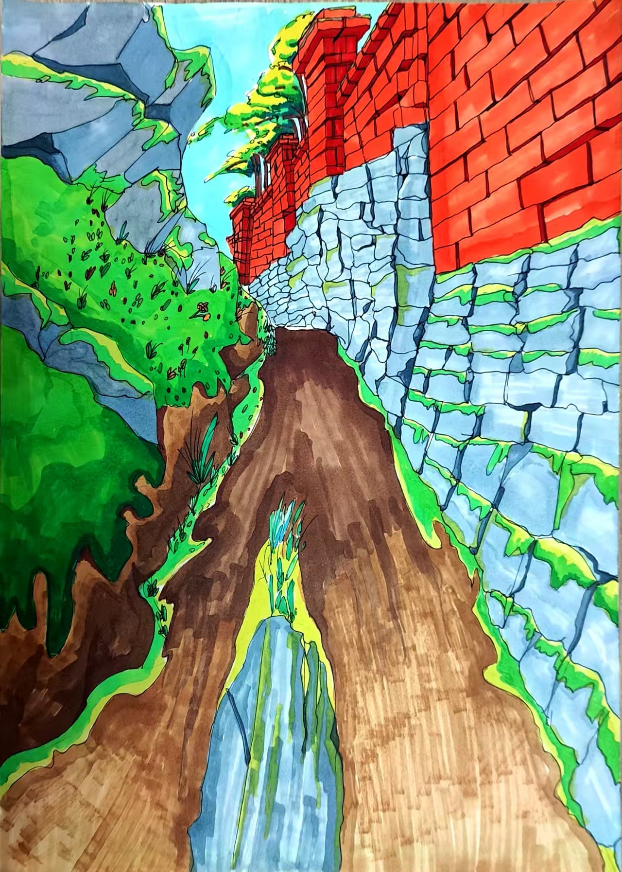 门前的这条小路陪我度过了许多快乐的时光,小时候我把这条路想成"城堡探险"的秘密通道!红砖墙是城堡墙,小土路上是保卫城堡的蚂蚁"卫兵",我喜欢这条小路,它是我最沉默的伙伴,承载着我的众多欢乐的时光。 所以我想用鲜艳的水彩,放大的对比度来描绘这条秘密通道。