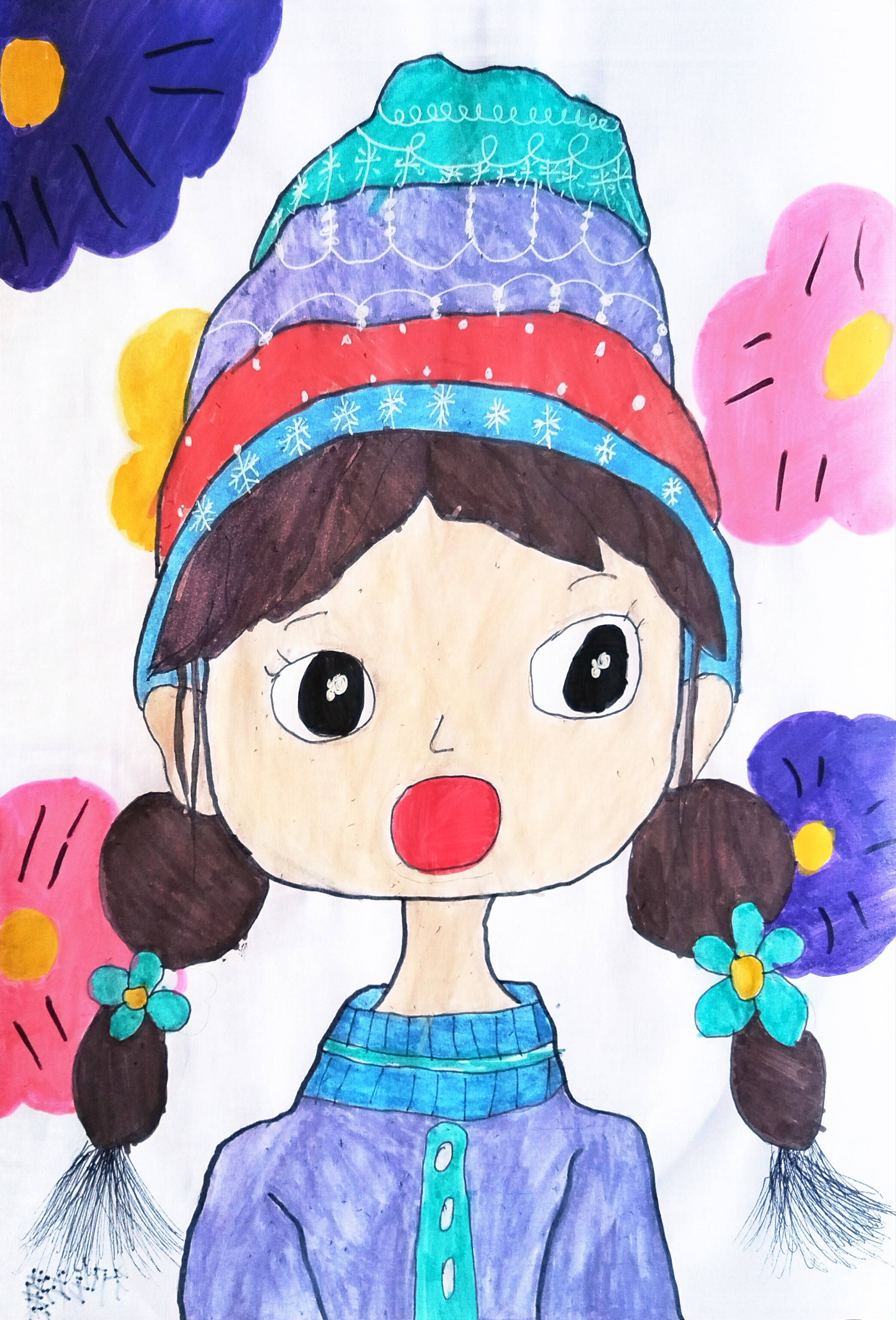 画里的女孩戴着织满雪花纹样的彩色冬帽,却扎着缀着小花的麻花辫,背景的大花更是把冬日穿搭和春日生机揉在一起,像把春天偷偷藏进了冬装里~圆溜溜的大眼睛和嘟起的红嘴,又添了股活泼的孩子气,暖色调的搭配让冷冬感里裹满了软乎乎的可爱