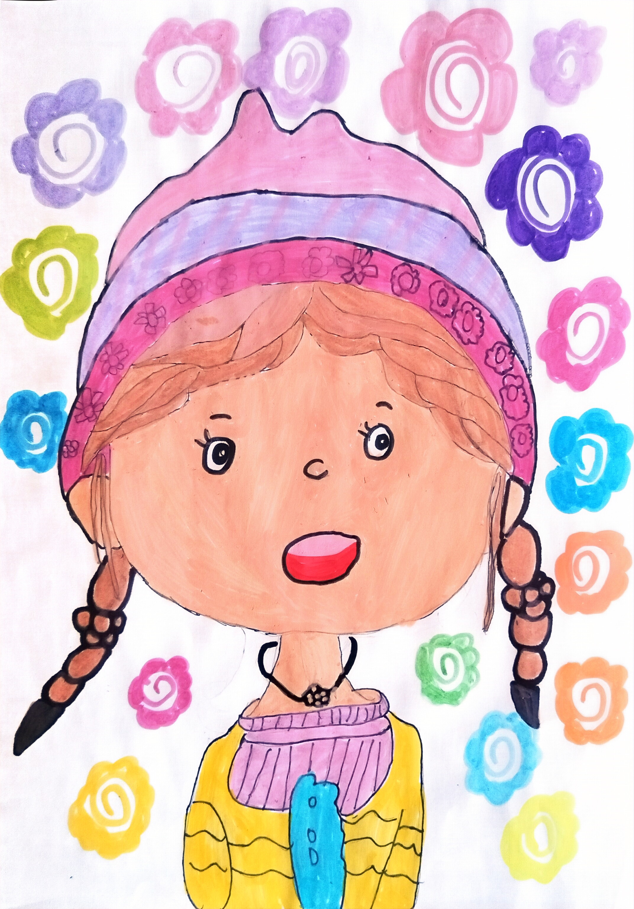 女孩裹在柔彩花海里:粉紫拼色帽配着碎花饰带,棕辫垂在肩头,圆眼翘唇透着甜软笑意,黄衣紫领衬得神态更鲜活。周围的彩花像把春日调色盘揉进背景,既用柔和撞色衬出温柔氛围,又以孩童式的鲜亮笔触,把日常模样画成了藏在花团里的甜俏小精灵。