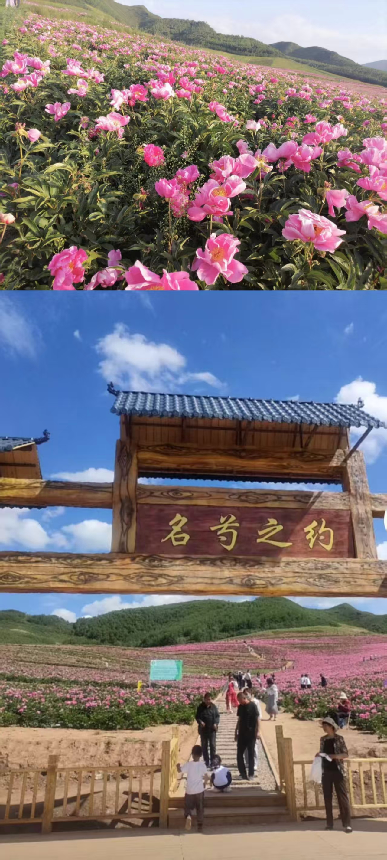 我们看惯了大城市的高楼大厦,走遍了城市里的大街小巷,也欣赏欣赏过了各类亭台楼阁,想不想黄羊川看看我们的花海----名芍之约的芍药花海。 当清晨的第一缕阳光把花海染成金粉色的时候,我们的花海----名芍之药的芍药花海里就飘出了缕缕清香,那是芍药花的药香,踏上九九八十级台阶,就进入了花海的山门,苍劲有力的名芍之约山门敞开迎接远方的客人。 走进山门江山遍野的全是芍药花,粉红的可爱淡红的娇艳,纯白的妩媚,站立在阳光下翩翩起舞向你招手,还有那含苞待放的一朵朵芍药花骨朵像刚刚睡醒的小仙子,层层叠叠,白里透红粉嘟嘟的,嫩黄的小花蕊别提有多可爱。 风吹过来粉色的花浪此起彼伏,花香四溢,甜甜的让人浑身舒坦。