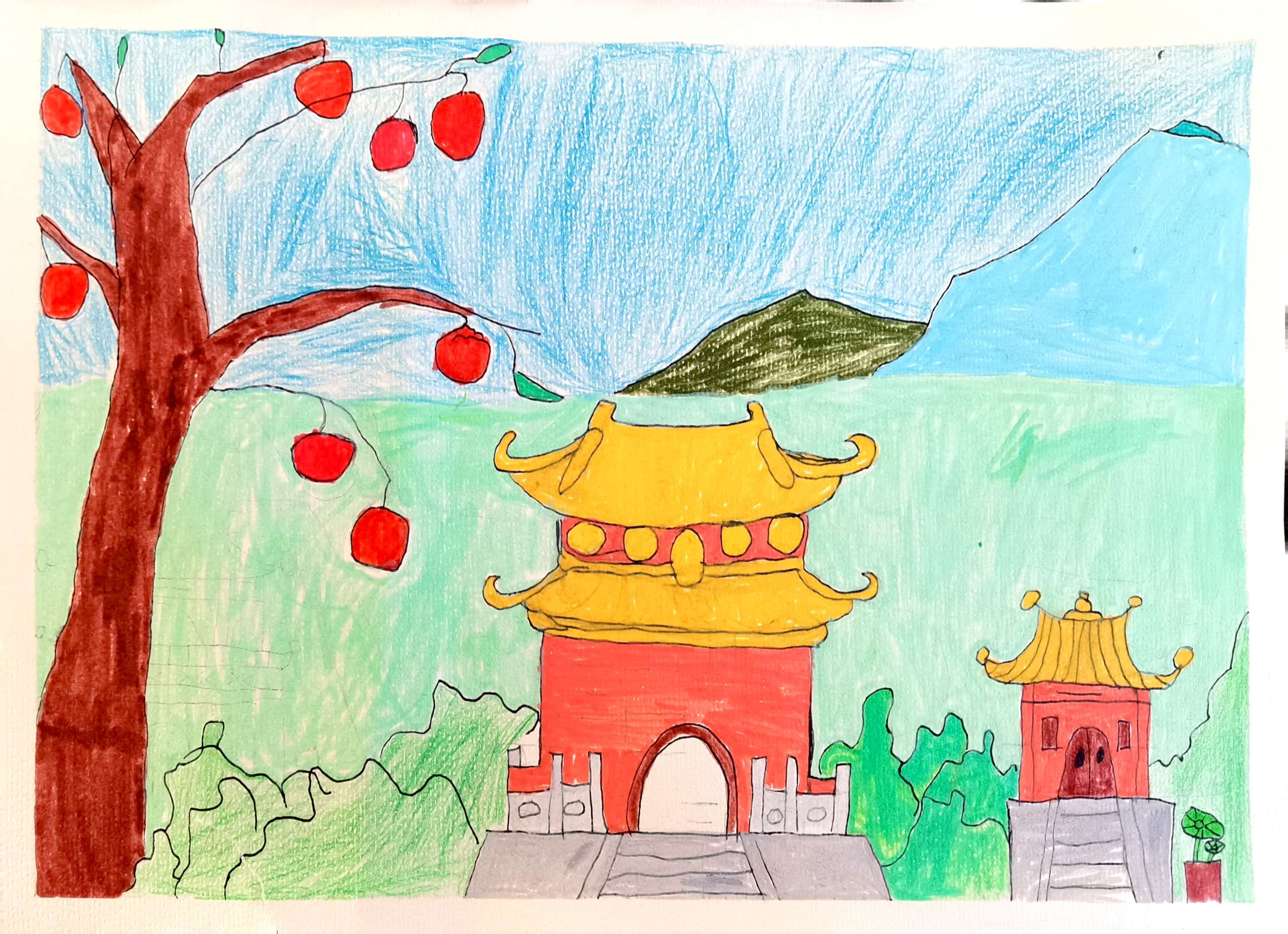 此画重点描绘了学生心目中古代建筑的样式。这幅画是一位四年级同学笔下的古风小世界,满是童真的想象力!远处的青山像一块软软的绿绒布,层层叠叠铺在天边,。山脚下的大树可精神啦,粗壮的树干、茂密的树叶,像一把把撑开的绿伞,小鸟说不定正躲在枝头做游戏呢! 画面中间,两座可爱的 “小庙” 特别显眼,翘翘的屋檐像小鸟张开的翅膀,金黄的屋顶、圆形的拱门,看着就像童话里的小城堡,仿佛推门进去,就能遇见和蔼的老神仙。整幅画色彩柔和、画面温馨,把小作者心里的古风童话世界,完完整整地展现了出来。
