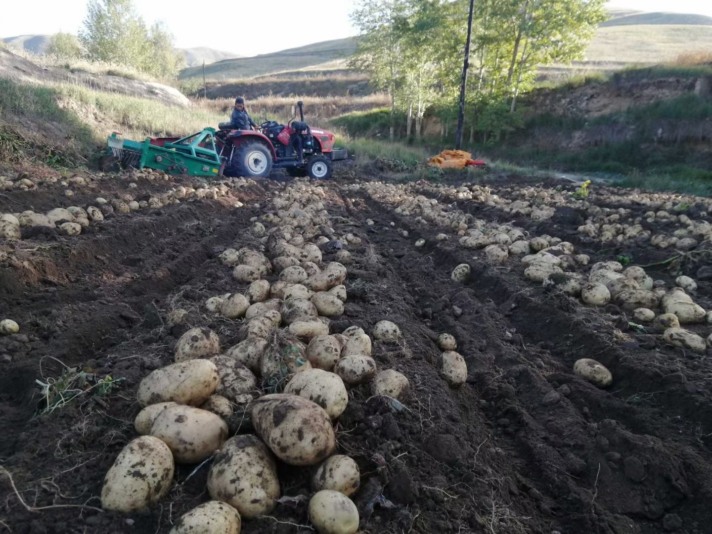 秋天丰收的风带着泥土的清香,吹拂着大地,咱们家的洋芋开挖咯! 哥哥将我家的四轮车,“突突突”地开进地里,车后挂着的兜筛跟着一起晃悠。车轮伴着尘土飞扬的碾过,藏在一垄垄泥土里的洋芋就被哗哗的翻了出来,在兜筛上打个滚儿,像一个个圆滚滚的小胖子跳在了车子后面。兜筛把洋芋和泥土、碎草分开,车子前面走,后面堆起了一小行行胖乎乎的洋芋,看得我眼睛都直了。 我兴奋的跟在车子后面,一会儿捡起一个“胖娃娃”,一会儿把滚远的洋芋抱回来,还偷偷和最大的那个洋芋比了比个头,结果我还没它“壮实”。大人们也没闲着,他们挎着竹筐装洋芋,然后把大堆的洋芋搬到车斗里,全家人的笑声和四轮车的突突声混在一起,别提多热闹了。