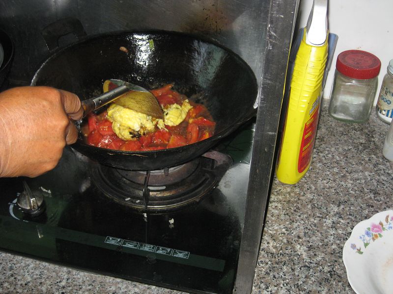 (3)把两个切好的番茄倒入锅中,来回翻炒。