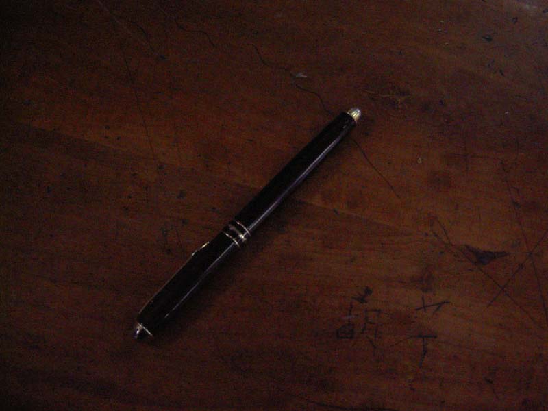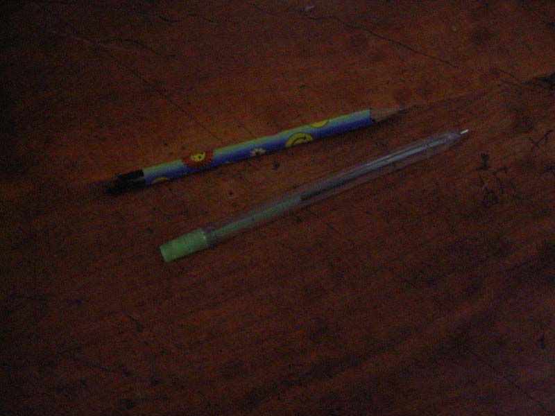 那个缺胳膊少腿的是圆柱笔,那是我哥上初中时用过的,现在就轮到我了。大体它是白色的两边有黑色和蓝色相杂,虽然表面已破的不成形了,但是写起来还是挺顺手的。