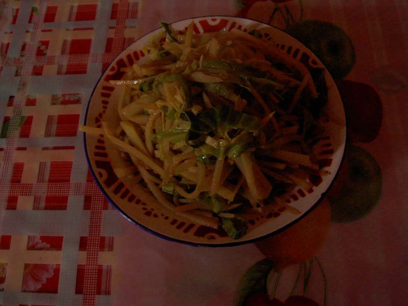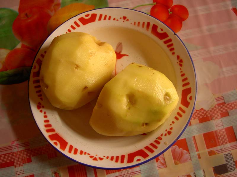 山药还是我们这儿的主要食物,山药菜就是我们这儿的代表之一,在做山药菜是首先要把山药上的土洗净,洗净后的山药看上去十分惹人喜欢,它那白白的皮肤和它那身上的一个个的小洞,你可别看不起这些小洞,这些小洞就是山药的出芽的地方,到了春天种山药的时候,这些小洞就会发芽呢!