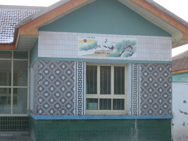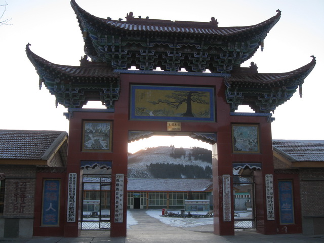 当你顺着街道走在那柏油路上,向左看时,便可以看见一个似寺庙的高约4米的大门,雄伟壮丽。再往前走你就可以看到一个很大的院子,地面用水泥板铺成,里面的东西可多了,让我一一介绍吧。