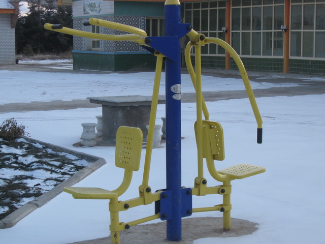 草坪旁边还有许多的健身器材,用蓝、黄色的油漆刷成。有锻炼腰部力量的,有锻炼双腿力量的,还有锻炼胳膊力量的。因为冬天天气冷,所以人们不用它,只闲放在那儿