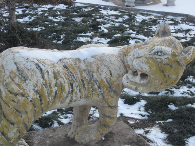 首先院子中间是一个草坪,里面有各种草,还放着石雕的牛、羊、虎、狮兽像,各具情态。其中的虎兽像,面目可爱,龇牙咧嘴,好像在看什么有趣的事情。一只豹子稳若泰山的站着,四蹄粗而结实,让人看了好像真的是活的。