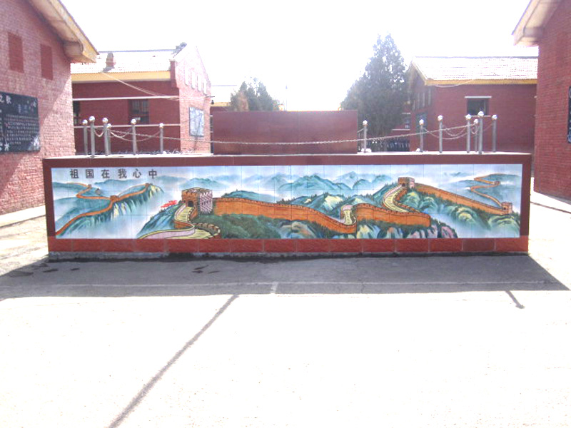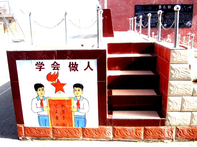 旗台大约高1.5米,表面使用瓷砖铺成的,左右两侧各有一个往上走的阶梯。旗台中间高高竖立者一根旗杆,看着旗杆上的国旗随风飘扬的雄姿,真令人顿生自豪之感。在旗台的正面有一幅图画,上面描绘的是我国的万里长城。欣赏着蜿蜒盘旋的万里长城,我感到我们真应该要为祖国的将来而奋斗。在旗台的左右两侧也各描绘着一幅图画:左侧是两个同学在举着一面旗,上面写的是“机智勇敢 见义勇为”;右侧是一幅老师教学生操作电脑的图。这些图画都是叫我们如何做人的,看着它,真让人有一种使命感。在旗台上还竖立着几根铁杆,并用铁链连在一起,给人一种不可侵犯的感觉。确实,我们祖国的的国旗怎能让人随便亵渎呢?