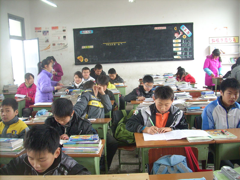 走进教室你会看见57张桌椅。可以看见一个讲座。左边是一扇窗子,窗子上面贴着我们班的班规和每次考试的结果。考试一下来同学们都到那里去看成绩。搞的那里很热闹,也很紧张。因为有的同学去了那很伤心,但是有的同学很开心。那时因为考试的结果会影响他们的心情的。