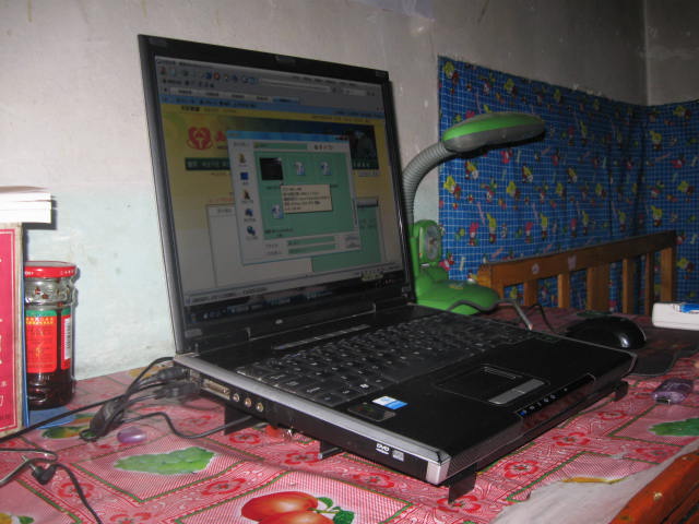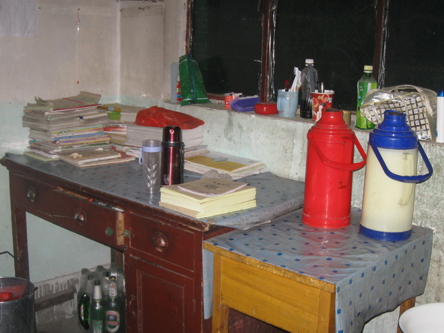 刚进门就看见一个简陋的写字台,上面放着老师的一些书籍,窗台上放着一些生活用品,如牙刷、暖瓶------旁边还有一个温暖的火炉,还有一个电脑桌。这个电脑就是我们发表“西部故事”作品的电脑。每当需要什么资料的时候,他就毫不吝啬的给我们查找资料。