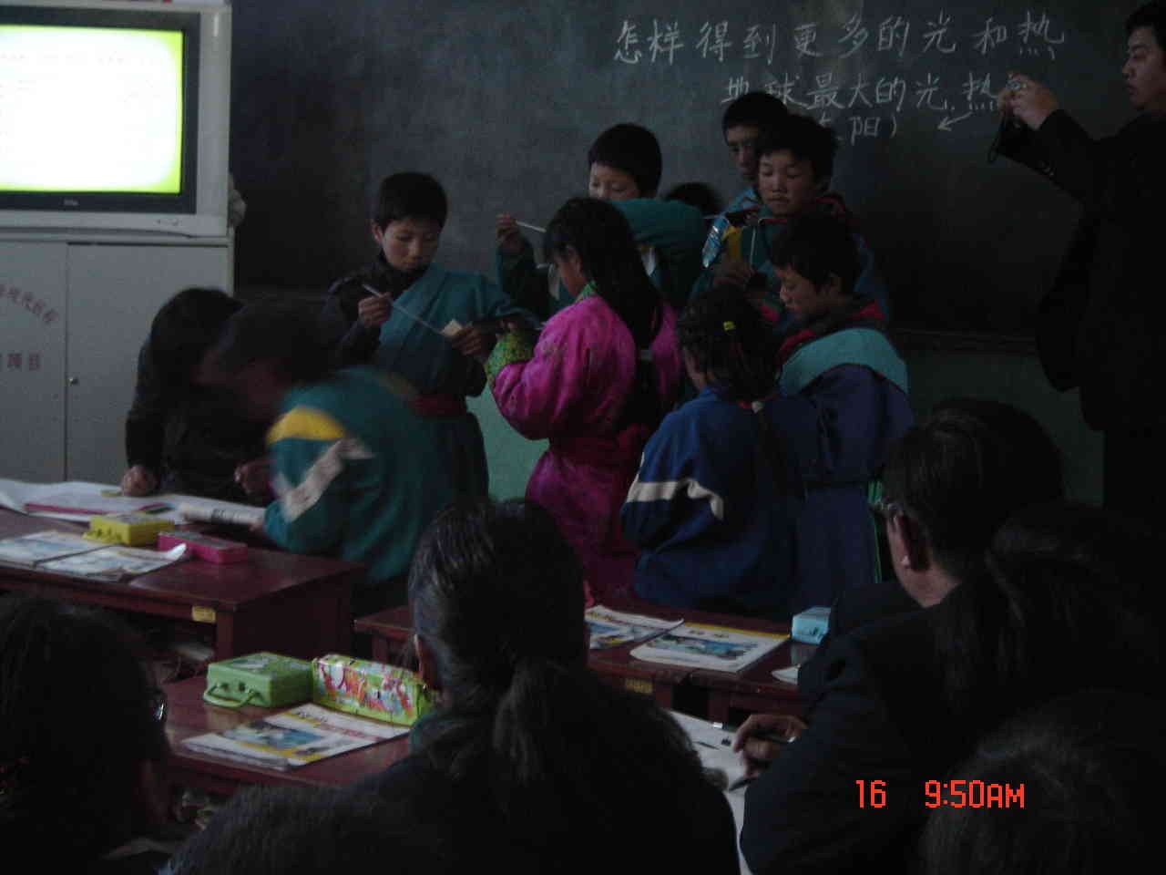于是老师用电脑出示了实验要求,又给我们各小组分了工,发给我们各种颜色的纸袋,里面各一个温度计,然后带我们到教室外面做实验。不同颜色的纸袋都放在太阳底下,同一种颜色的纸袋也有不同的放法,有的与阳光垂直,有的与光平行。过五六分钟记一次温度,做了两三次后,我们又回到教室整理数据,一起讨论问题,大家都发现深色的纸温度升的快,浅色得纸温度升的慢;同时,同样的纸,与太阳垂直的温度升的快。