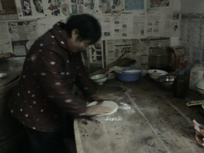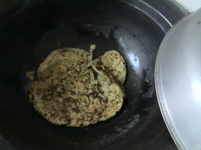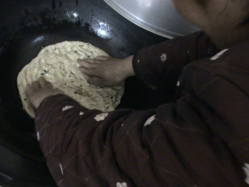 第四步:烙馍。我们给锅里多倒些油,将油烧成八成熟后,将面团放入,这时用手不停的压,将面团要压的尽量薄,等将面压好后,我们盖上锅盖,再放锅底下填柴,对于柴也有讲究,最好是麦草,每次填入的麦草不能太多,把麦草填入后,要立马把柴分开,这样避免一处过热而使馍焦了。就这样,等一会烧一下,将馍翻个过,再烧。直到馍熟。