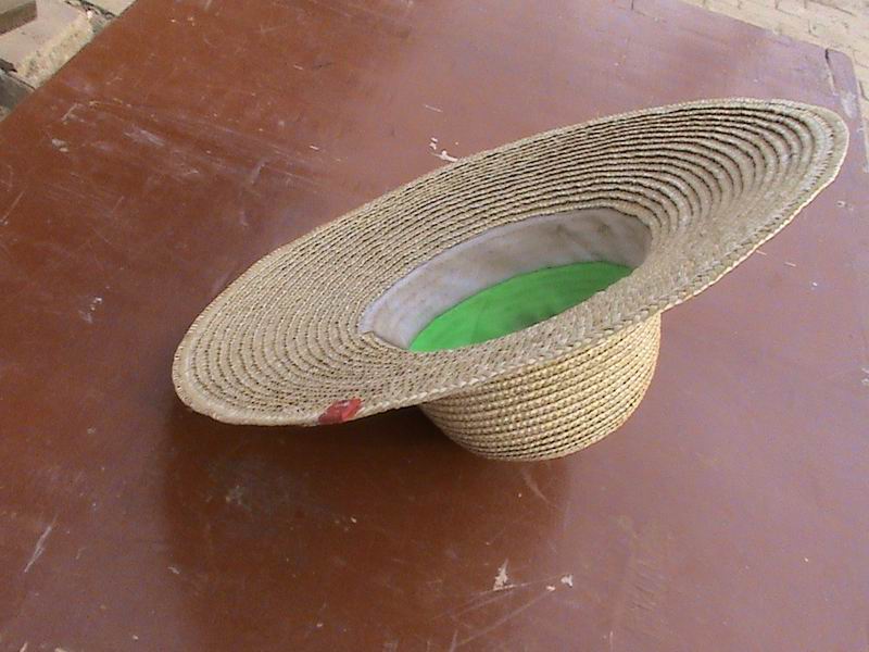 瞧,这就是草帽,不知大家见过吗,说它圆吧,它只是沿圆,它的边沿平平的,像是一个向日葵,中间是凹形的像一个大碗。从它的处表来看,好像是一个用很多材料而且很难做成的东西。