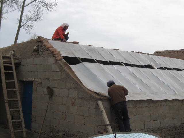 盖温棚的这天正好是星期六,我回到家后,看见爸爸和嫂子正在把万通板往三角铁上固定,爸爸看见我来了,就让我赶紧放下书包来帮忙。我放下书包后就上到房顶上抓住铝条,让爸爸把万通板和三角铁固定在一起,费了大半天劲,才把一个万通板和三角铁固定好。