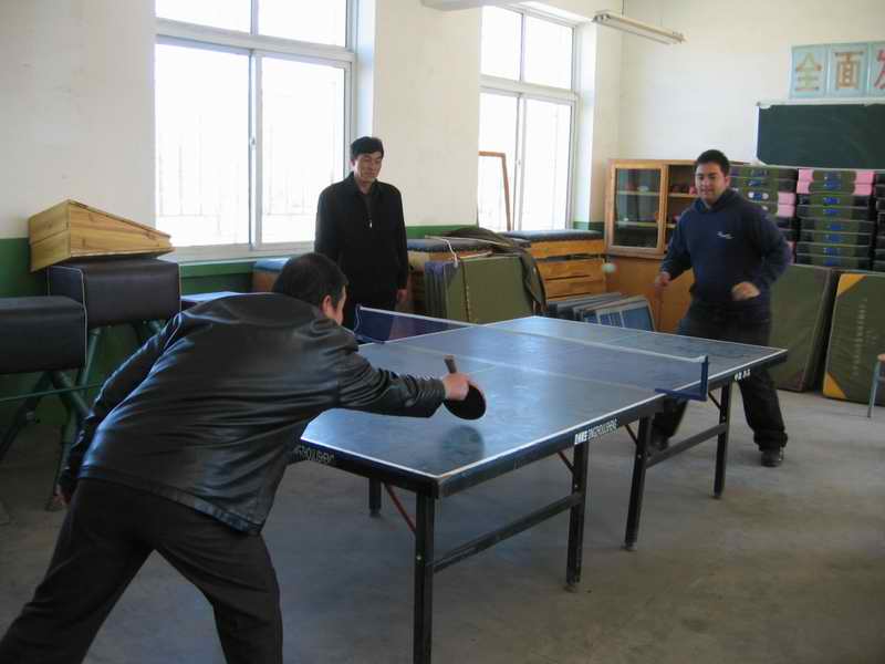 老外真是活泼,拉着我们学校的老师要进行乒乓球比赛。看他那认真劲,我以为他的技艺很高,谁知,比赛一开始他那笨拙的像熊一样的动作,立刻惹得大家捧腹大笑。他连接几个球都没有接上案,嘴里连说"sorry! sorry!sorry! "他的这一系列动作惹得大家大小不止。