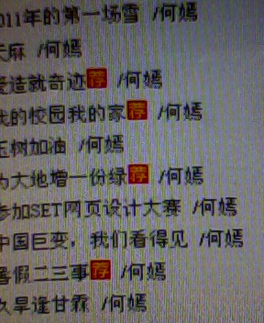 何嫣就是这碗汤中的一颗大红枣。看着她空间里的作品,带有一个红红的“荐”字的都占大多数。在我们这个团体中,“荐”字就代表着你的这篇文章很受欢迎,能使不知名的人士连连点击鼠标进入你的空间,欣赏你的成果。何嫣是我的前辈,算来我应该称她一声“学姐”。我看过何嫣学姐的几篇文章,都是从身边的小事抓起,很具真实性。她的文采也很风趣,偶尔一两句土话,就使人心身大快。何嫣学姐我们以你为傲,希望你越写越红。
