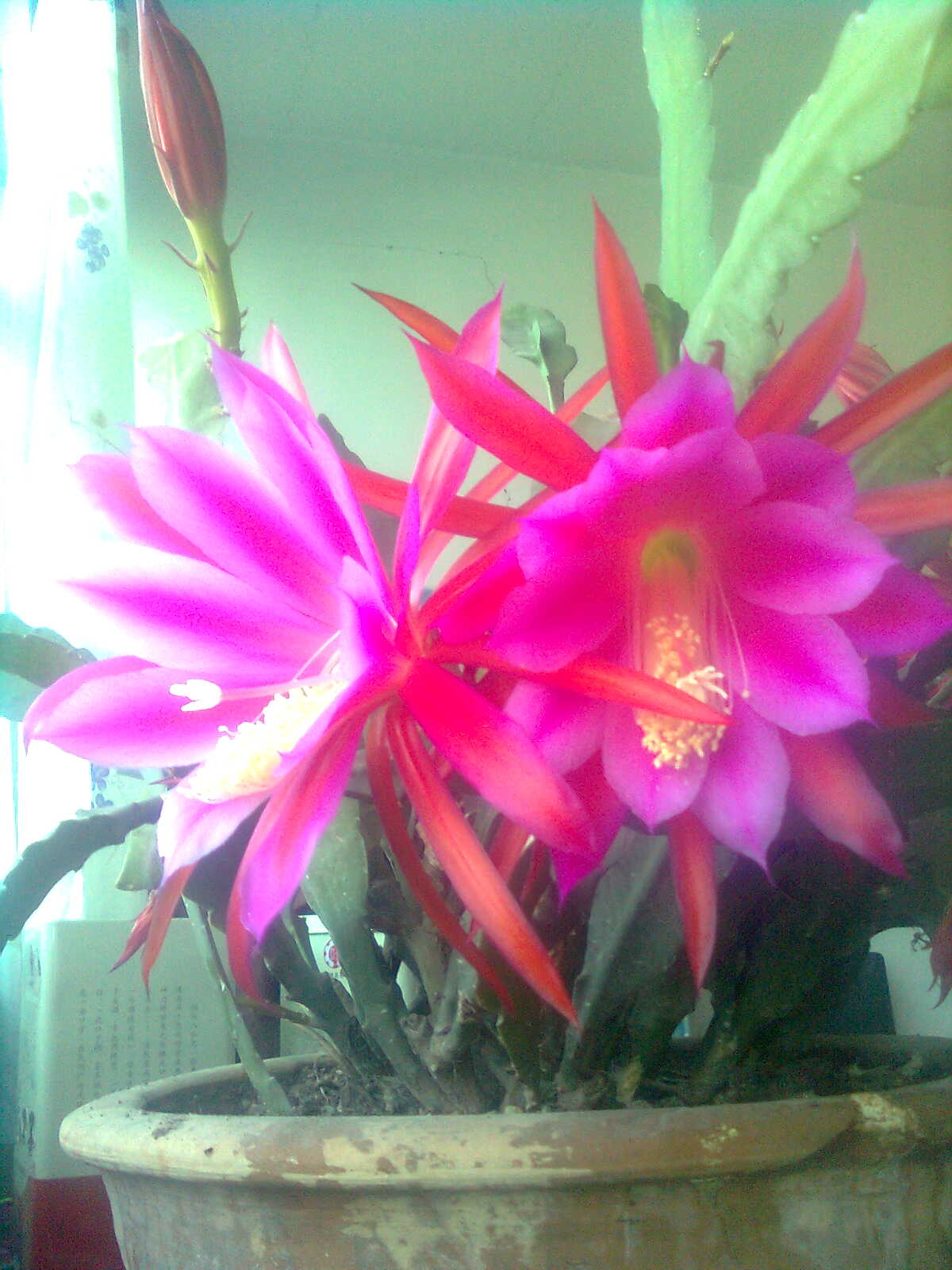在我的小家庭中,长着各种各样的花,大家现在所看到的是一种名叫“令箭荷花”的植物,它又叫孔雀仙人掌,在它生长到十岁后它才会开花,而且只开一天,就像“昙花一现”。其植株呈半灌木状,就像秦叔宝的秦家锏一样……