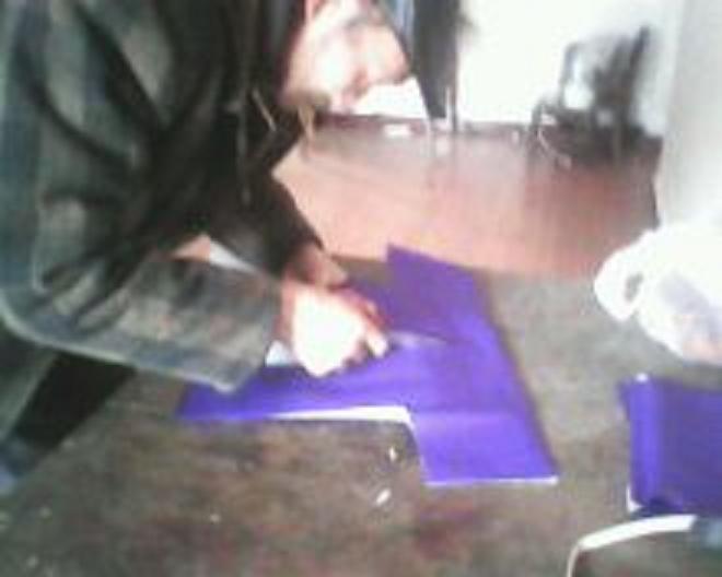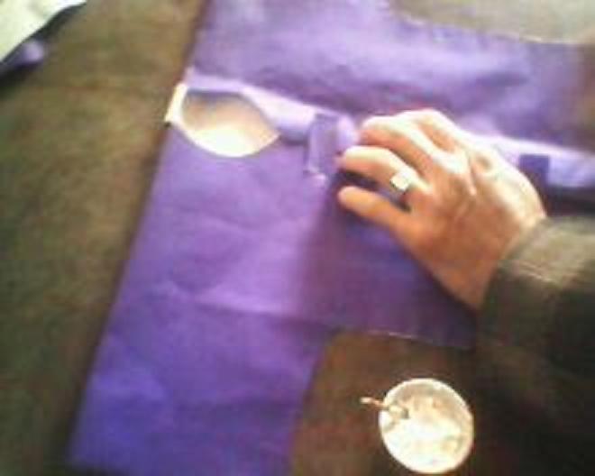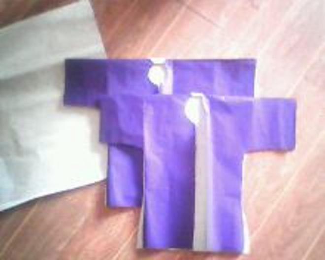为了折这件紫色的纸衣,爷爷可绞尽脑汁的苦想了一会儿!看着爷爷把方纸对折,然后打开中间就有一条中线,再把两边依着中线对折,最后用剪刀……看着这一道道的工序,一个老人能做的那么透彻、到位、,真不简单!