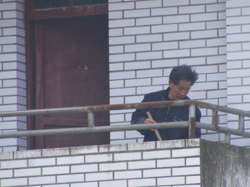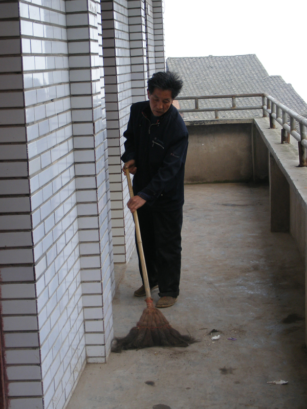 每周一,我们去学校时,都可以看见他在打扫楼梯的通道。他每周工作5天,他所负责的区域,总是干干净净的。