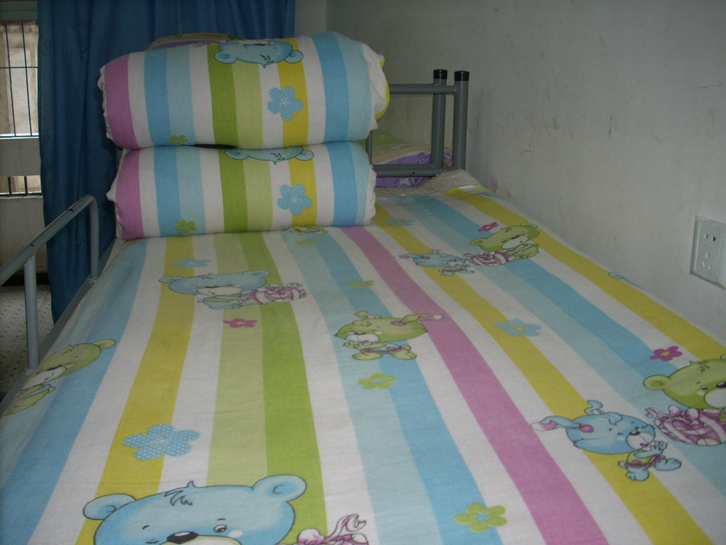 在我的床位,我睡在上铺,而我从来都不睡枕头,所以在我的铺盖上没有枕头,而在床的里面是空的,那是因为床头有一处的墙凸了出来导致床的里面是空的。