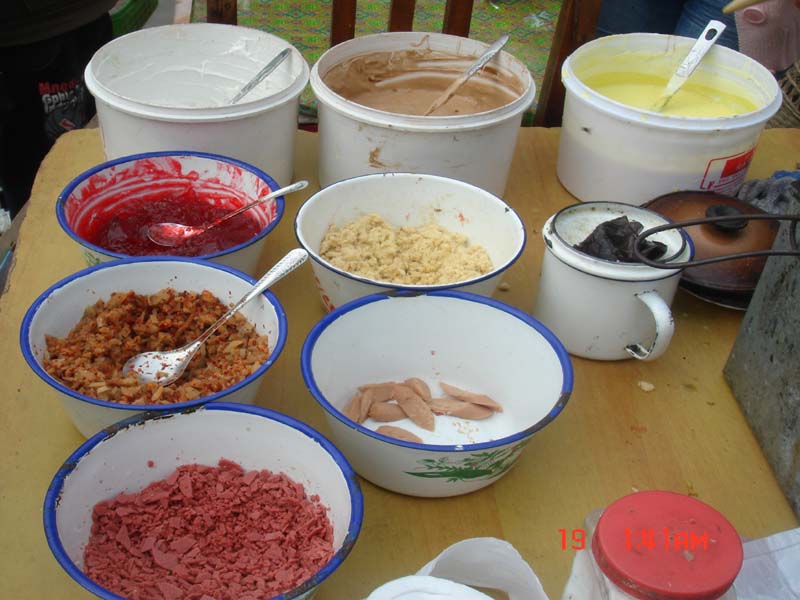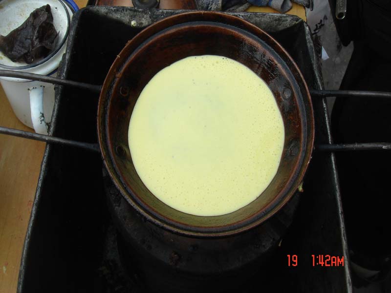 小贩们先将一部分粘稠的面粉倒进特制小锅中,待面粉弥漫在锅中的每一处,成圆形状。再等待1~2分钟,通常面粉此时已经煎熟,香味已经开始散播了,下一部就依顾客的喜好把材料放进面饼中拉: